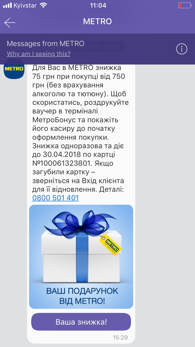 Мессенджер №1 в Украине – Viber с 20 млн пользователей. В начале 2016 году Viber разрешил компаниям делать коммерческие рассылки, и мы сконцентрировались на развитии в нем. При тесном сотрудничестве с Viber, мы даже стали в некоторых направлениях пионерами. Например, первыми в продуктовом ритейле выпустили чат-бота, который открывает карту прямо в мессенджере.
