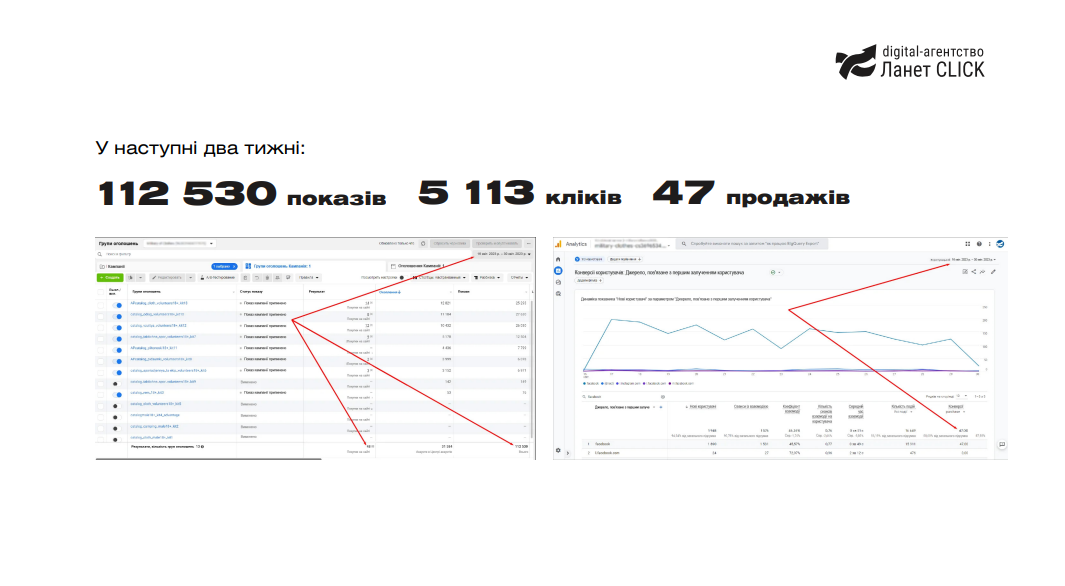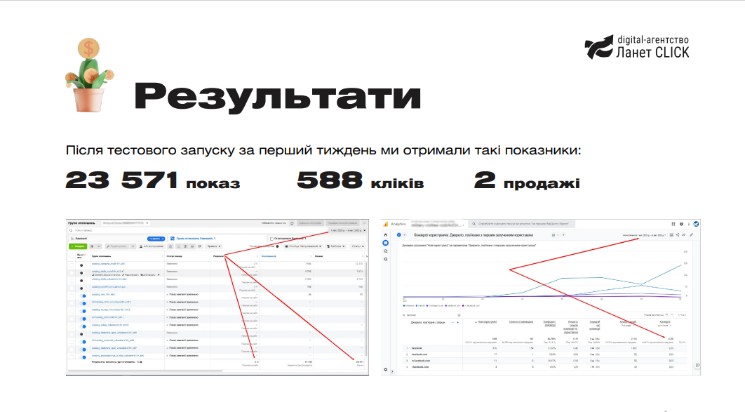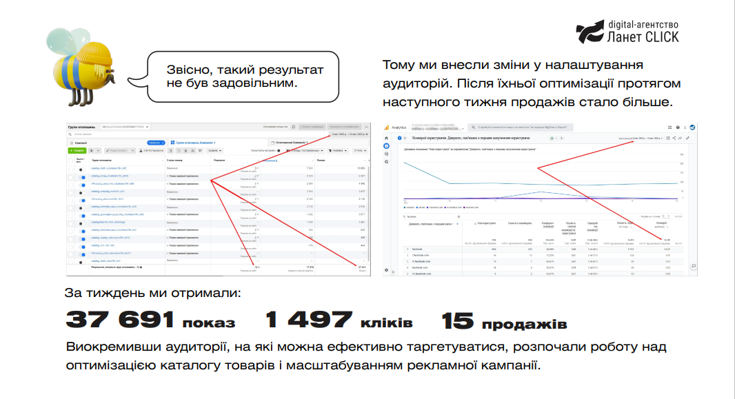 Эффективность использования рекламных бюджетов зависит от того, какую аудиторию выбрали, как проработаны креативы, и какой тип рекламных кампаний используется на платформе. Поэтому обычно на этапе поиска оптимального подхода, мы советуем клиентам не разгоняться в большие бюджеты, потому что часть их будет расходоваться неэффективно. И после тестового запуска за первую неделю мы получили 23571 показ, 588 кликов и 2 продажи.