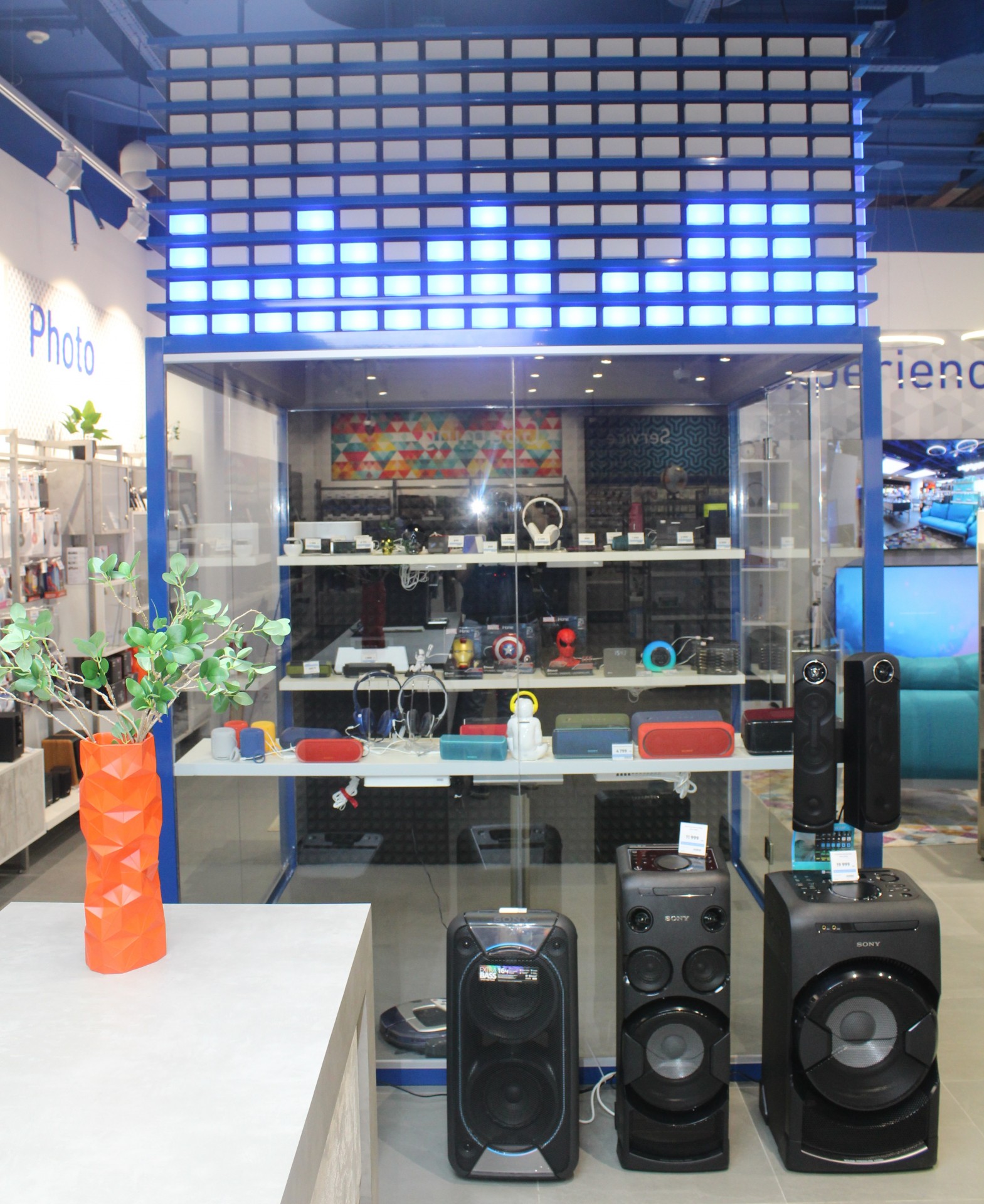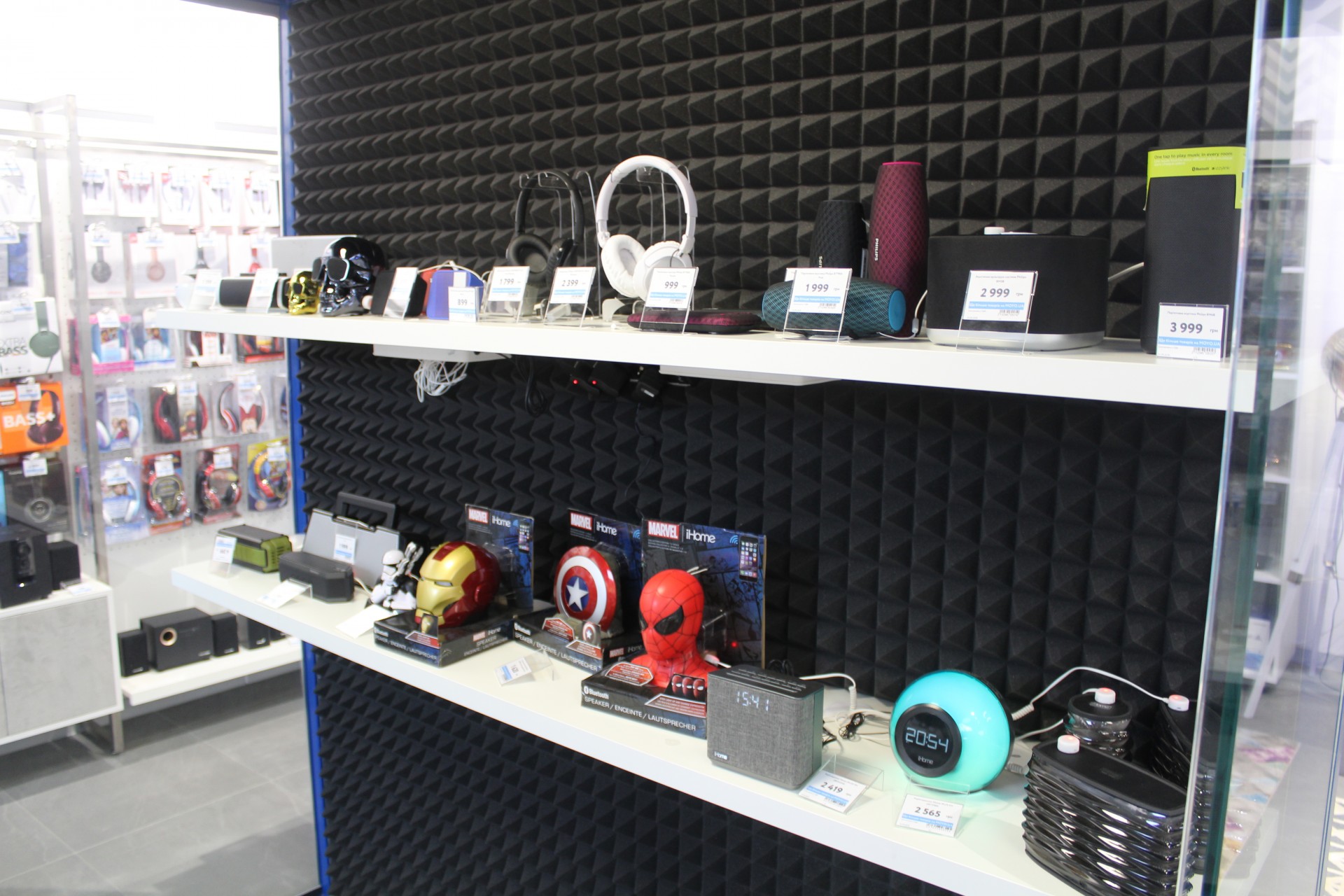 Благодаря шумоизоляции комнаты покупатель может подключить любую колонку к своему телефону, и проверить звук на полную мощность, не мешая другим посетителям магазина.