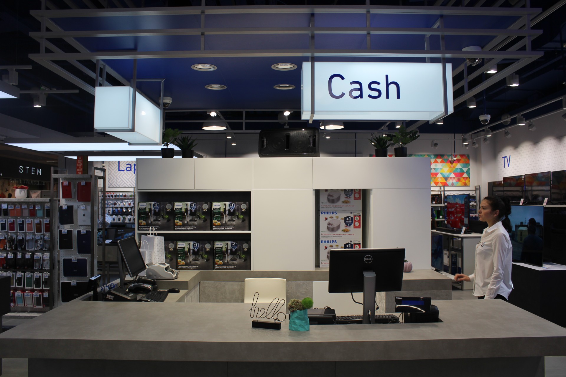 Основная касса расположена в центре торговой точки и похожа на кухню. В ней компания намерена представить ассортимент крупной и мелкой бытовой техники, тем самым напоминая, что эта категория также продается в MOYO.