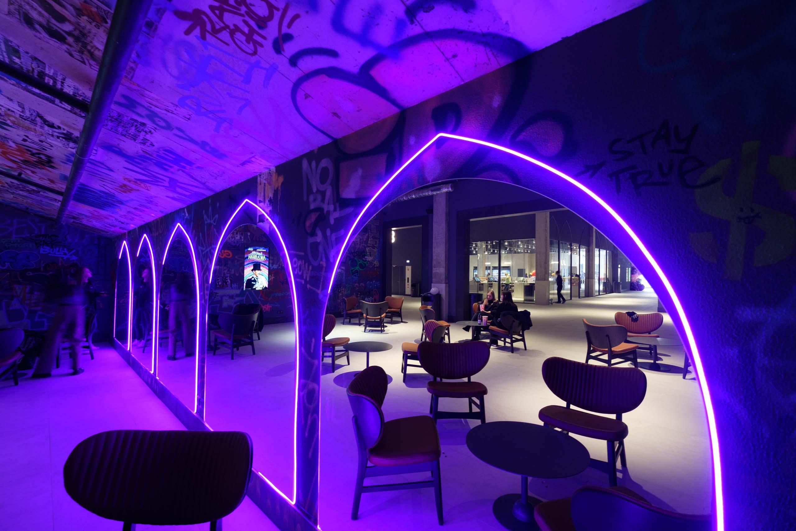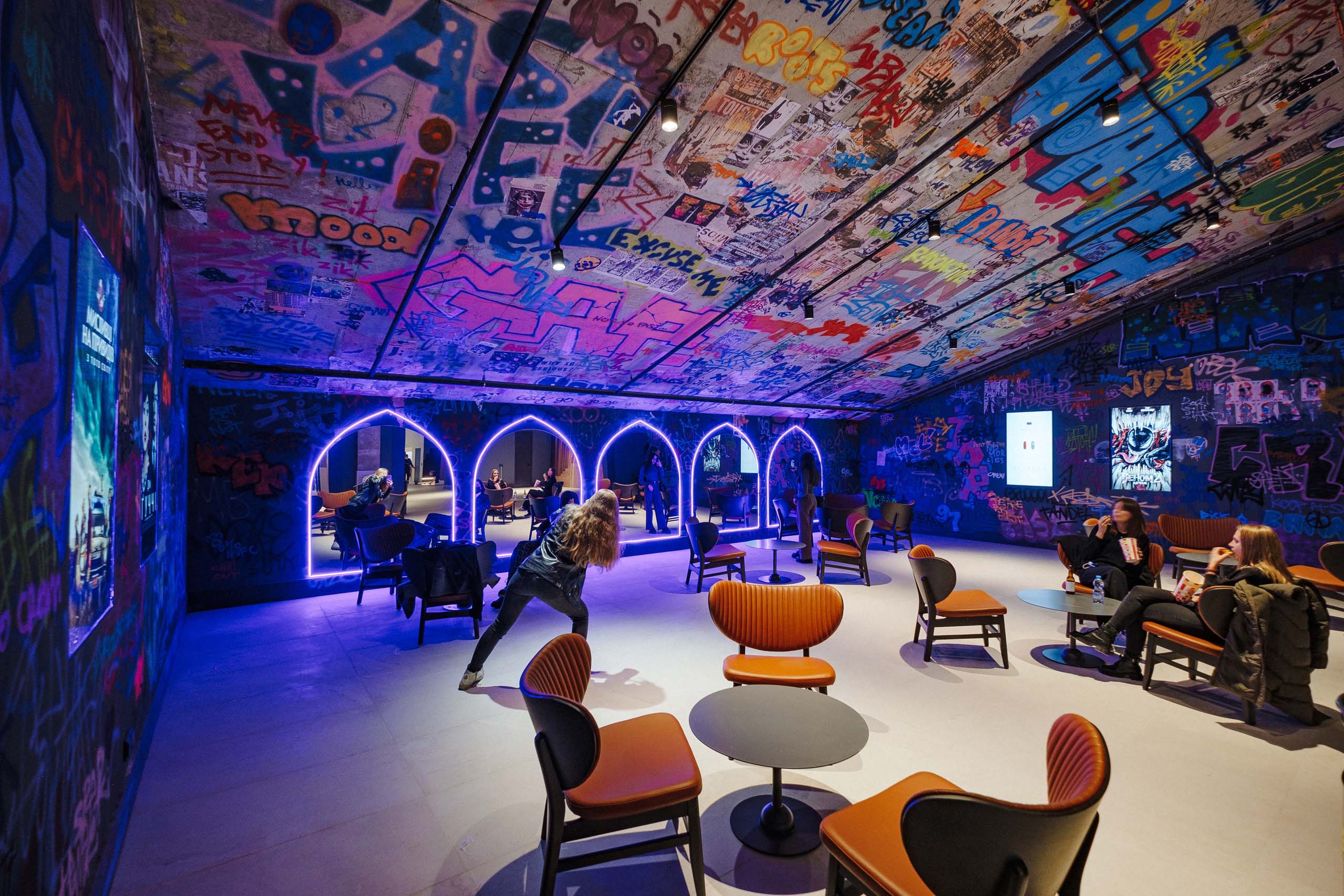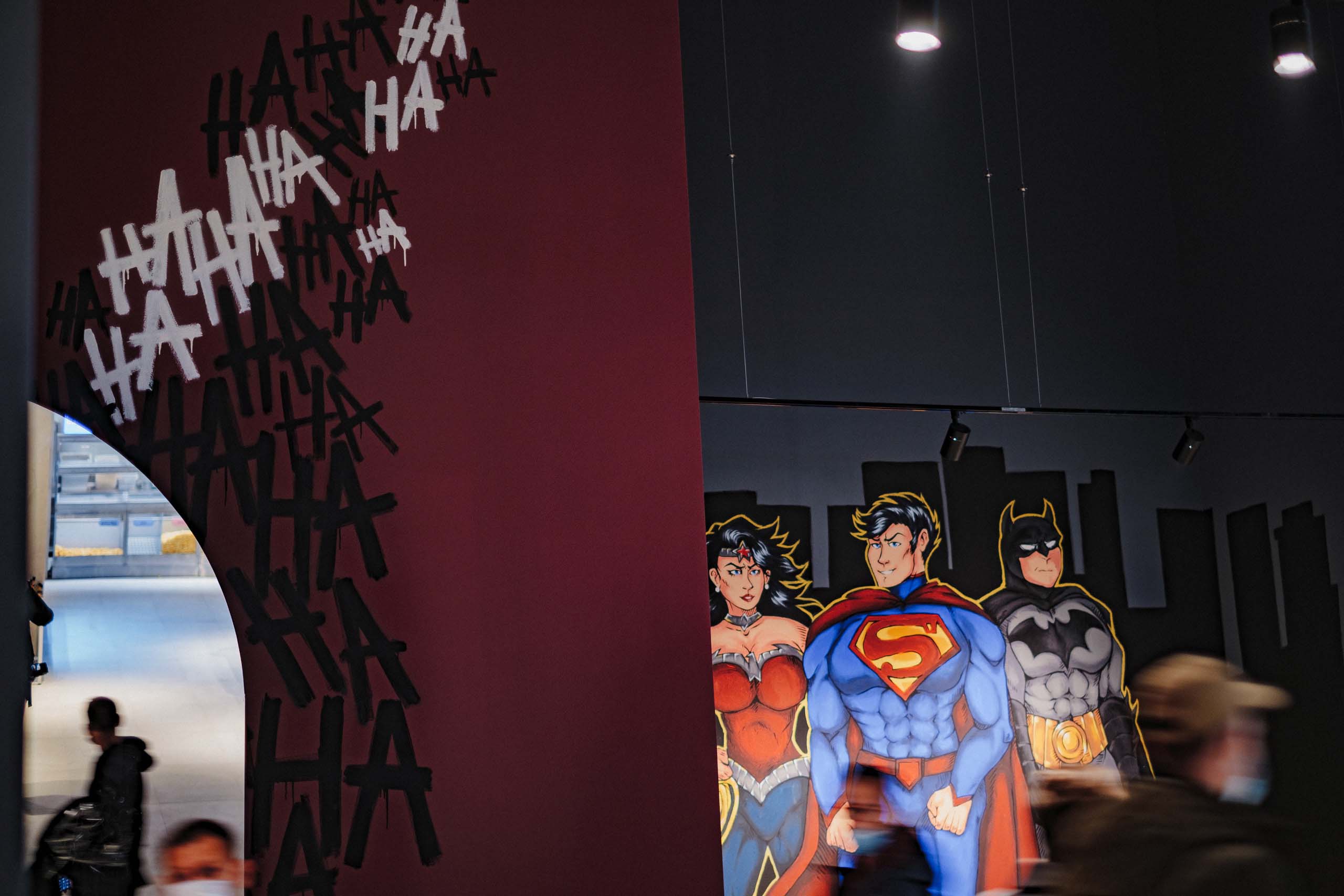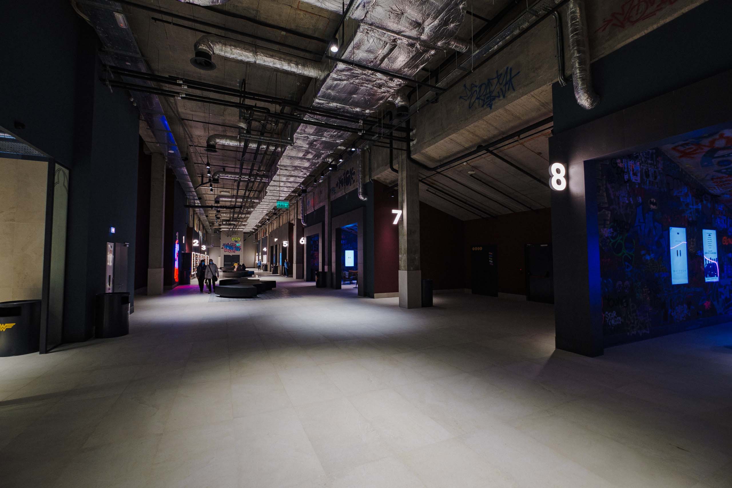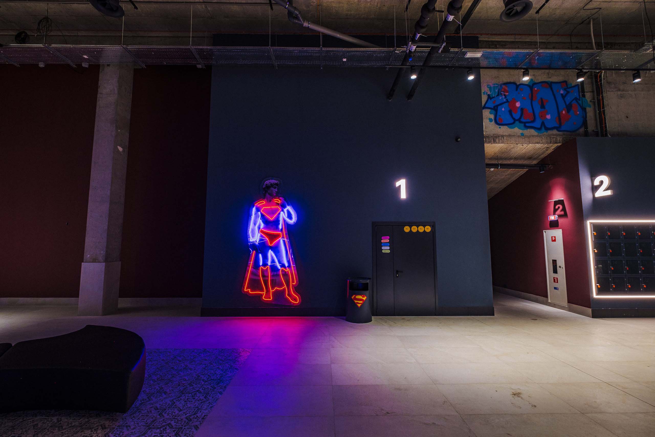 Пройдя по коридору, на стенах вестибюля можно увидеть тематические граффити, в том числе с изображением Джокера, Чудо-Женщины и скульптуры Давида работы Микеланджело, которую с помощью лазерной подсветки одели в костюм Супермена. Креативно выполнены также вестибюльные сиденья, сделанные под знак Бэтмена. Новый Multiplex так и намекает, что здесь прежде всего фанатеют от кинокомиксов.
