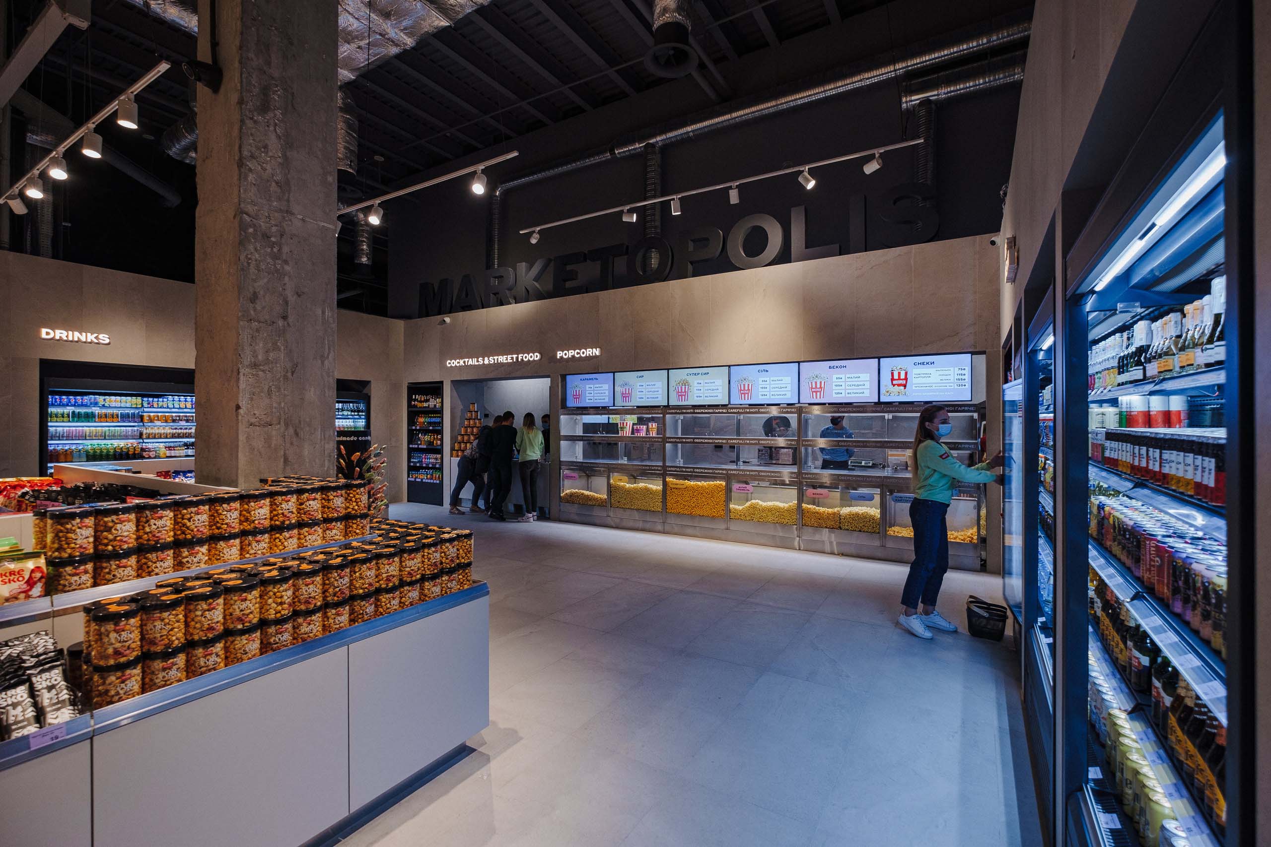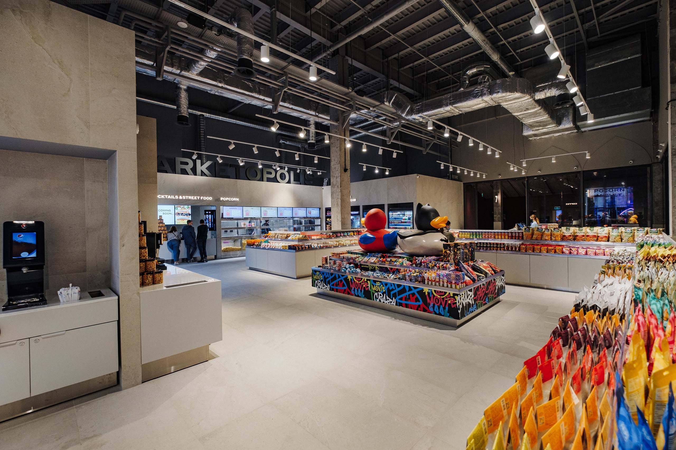 Полутемный вестибюль кинотеатра разделился на два “рукава” – один предлагает зрителям пройти к кассам и кинозалам, второй – в Popcorn Market. Здесь все желающие могут закупиться вкусняшками на сеанс. В день открытия также предлагался безлимитный Pepsi.