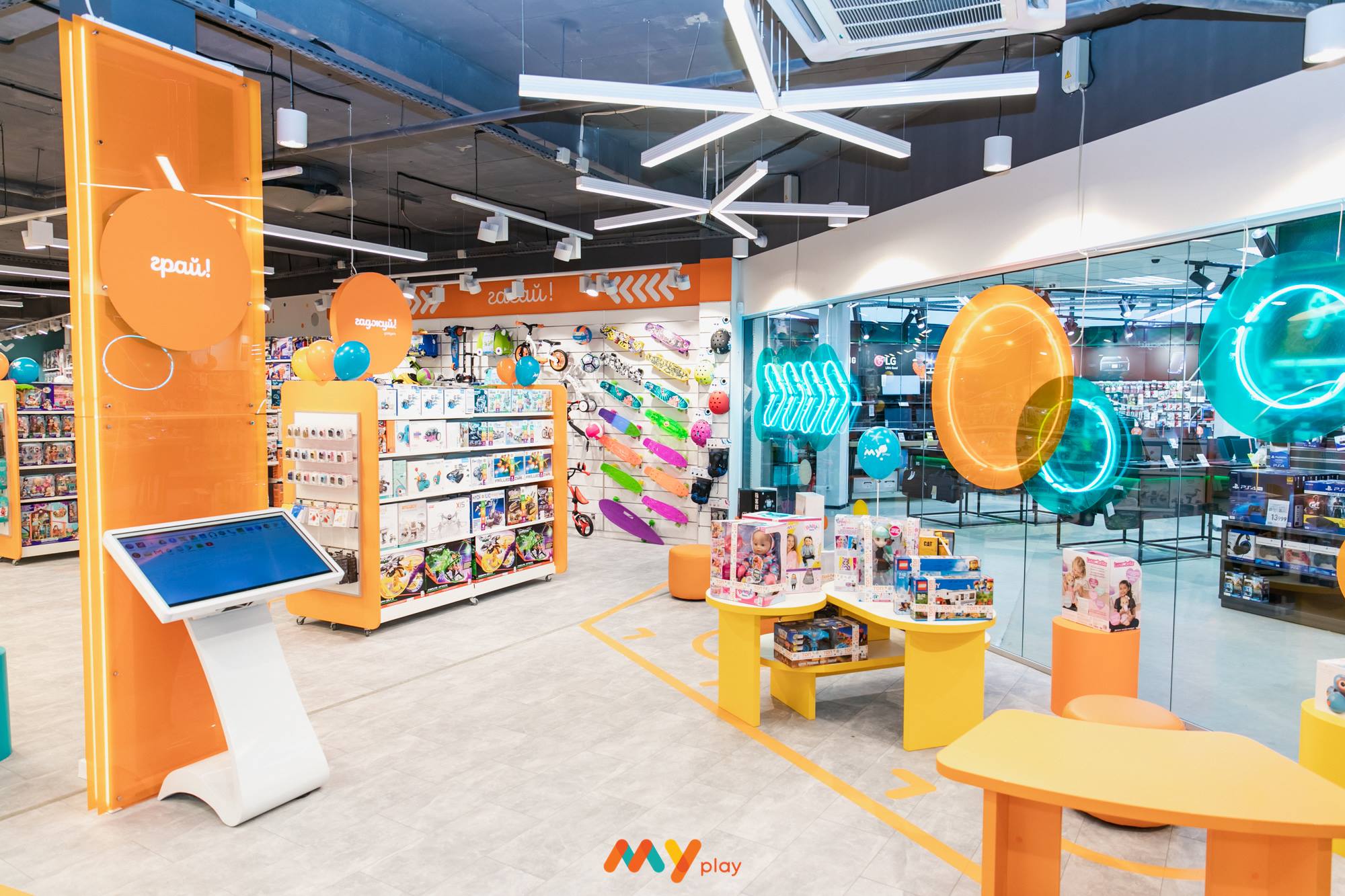Площадь нового пространства составила свыше 600 кв. м – это самый большой MYplay в сети. В ассортименте представлены гаджеты, смарт-часы, роботы, портативные колонки, наушники, игрушки для детей, объединенные по развитию талантов, товары для активного отдыха, одежда, обувь и сладости.