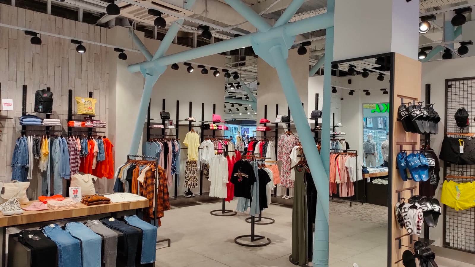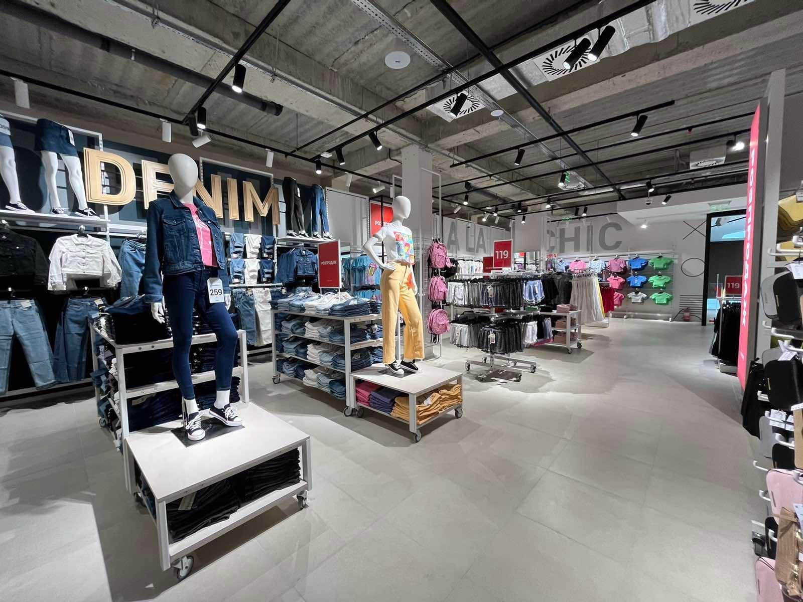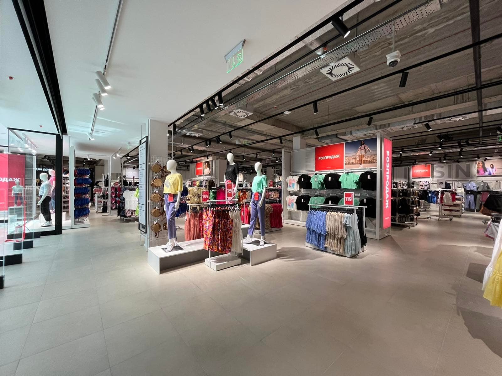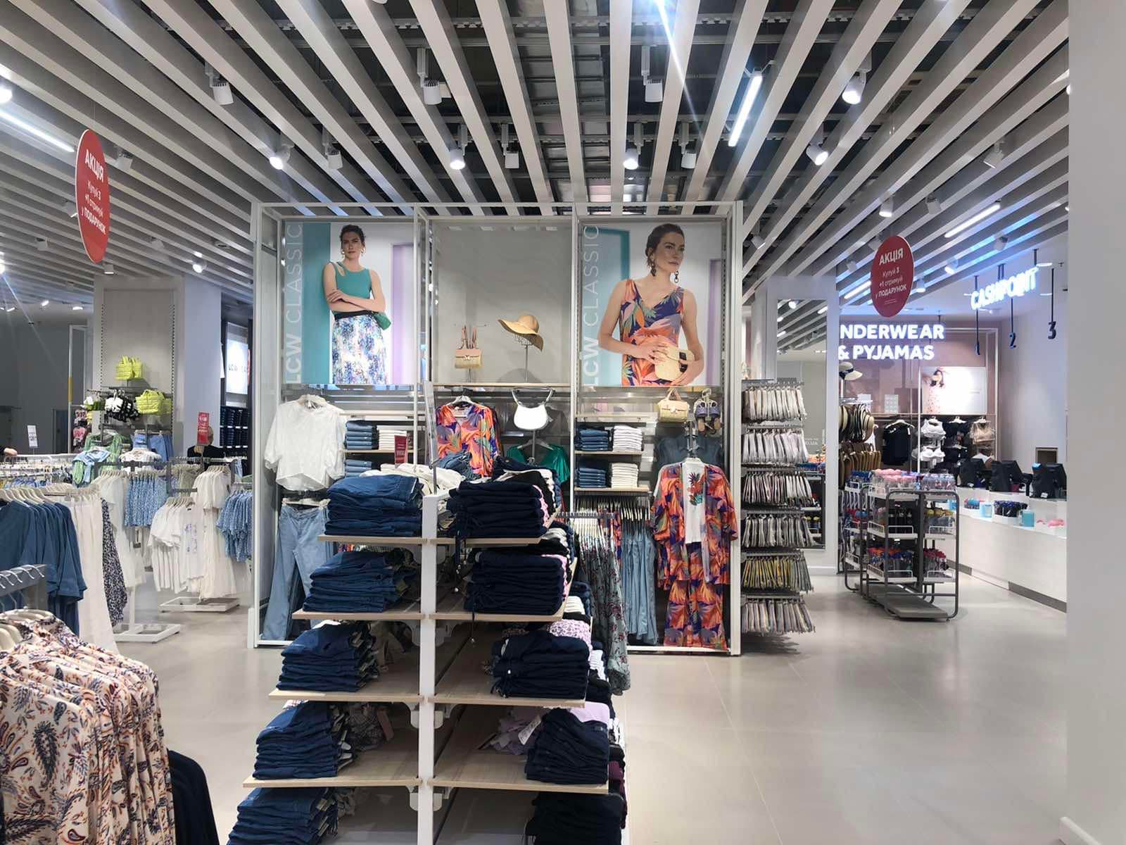 Эти магазины так же, как и в ТРЦ City Center, были исполнены в обновленном концепте с цветной навигацией, четким зонированием и со сфокусированным холодным освещением, что направляет внимание покупателей на стойки с одеждой.