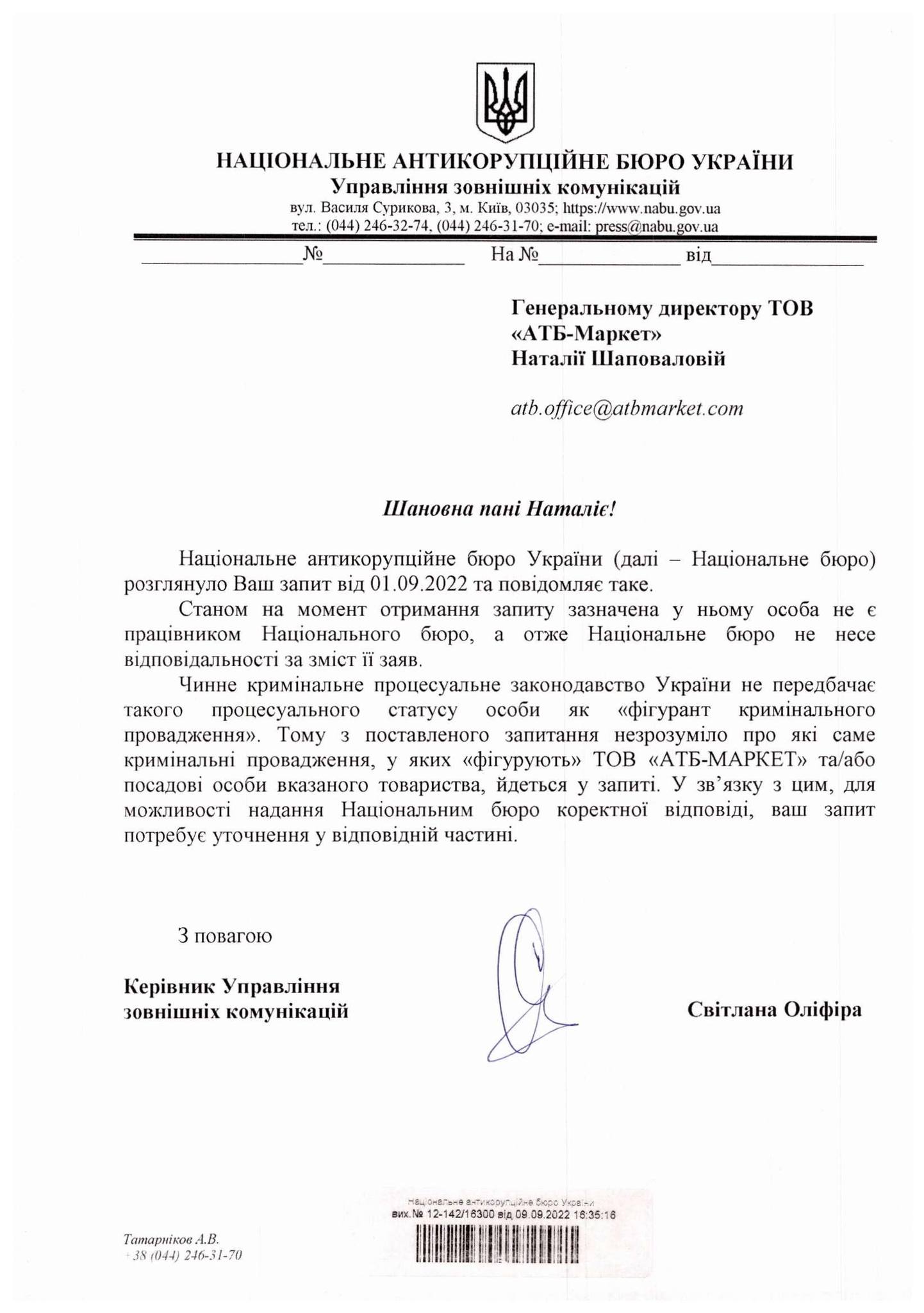 Дополнительно в госоргане отметили, что АТБ-маркет не является фигурантом каких-либо уголовных производств, инициированных бюро. Более того, НАБУ сообщили, что даже процессуального статуса “фигурант уголовного производства” в действующем законодательстве Украины не существует. Обращение и ответ НАБУ прилагаются.