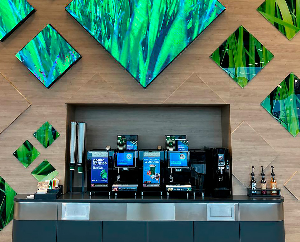 Скажем, водители грузовиков через отдельный вход попадают в «свою» кассовую зону WOG market со специально подобранным ассортиментом товаров и блюд, которые чаще всего покупают дальнобойщики. Пространство со столиками обустроено зимним садом и специальной подсветкой, чтобы пребывание здесь стало максимально комфортным и уютным для отдыха в дороге. Поскольку этот АЗК на пути от Киева уже пятый по счету, нужно сделать все, чтобы клиенты выбрали именно его, а не заправку конкурентов. К примеру, один из элементов создания комфорта – беспроводные зарядки для гаджетов, вмонтированные в поверхности столиков, а в качестве декора используются телевизионные панели на стенах.