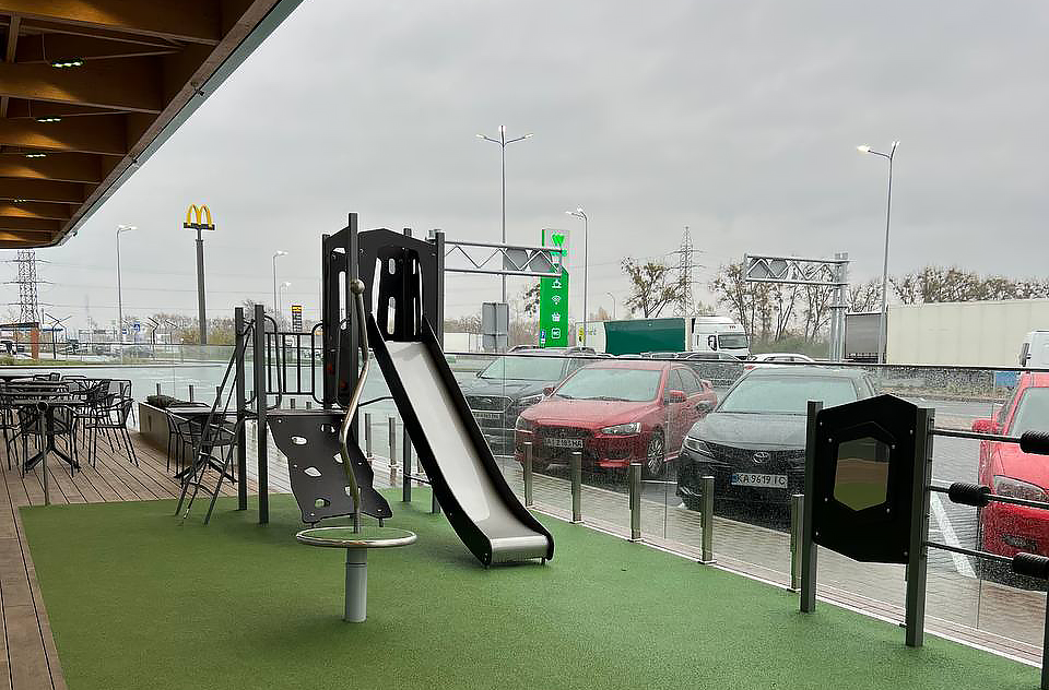 Внутри разные категории клиентов тоже обслуживаются в разных зонах, поскольку потребности водителей на легковушках (командировочные работники или семьи с детьми) несколько иные, чем запросы профессиональных водителей грузовиков, которые все рабочее время проводят в пути. Так, у места высадки пассажиров перед фасадом здания расположена летняя терраса на 62 места, рядом есть детская площадка с батутами и горками. Благодаря разделению потоков как снаружи, так и внутри просторного помещения с большими окнами и высоким потолком, удается обслуживать большое количество клиентов без ощущения тесноты.