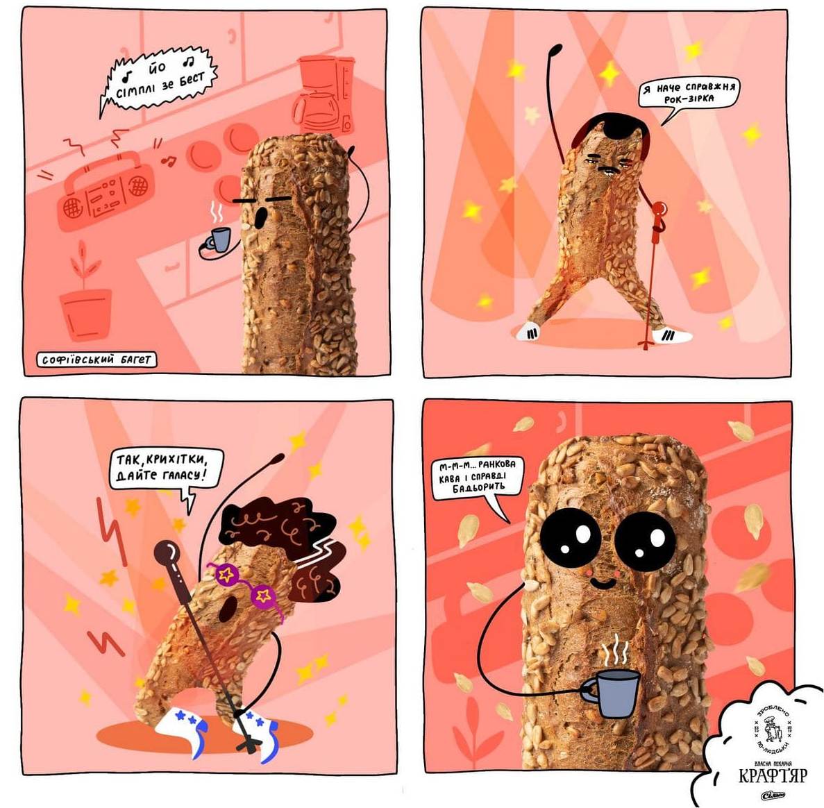 Тем временем Сільпо запустил собственные комиксы, сделав их главным героем багет. То он в роли рок-звезды выступает, то своими семенами гордится – пойди пойми тот багет.