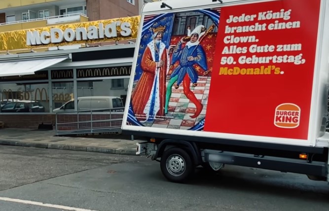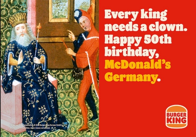 Burger King потроллил McDonald’s к 50-летию присутствия сети в Германии. На серии рекламных щитов в Мюнхене два бренда изображены как король и придворный шут в средневековых произведениях искусства с подписью: «Каждому королю нужен клоун». Персонажи, очевидно, символизируют маскотов брендов.