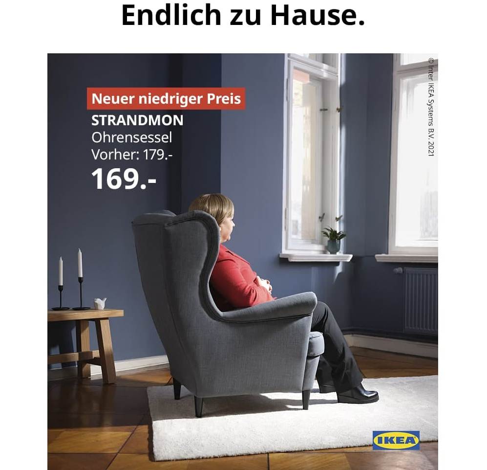 8 декабря IKEA опубликовала у себя на странице рекламный постер, где женщина, похожая на Ангелу Меркель сидит в кресле и смотрит в окно. На постере написано – “Наконец-то дома” (Endlich zu Hause). Также в публикации на Facebook добавили ироничную надпись: «Передайте мне бинокль для оперы, я хочу проверить, занят ли уже Олаф».