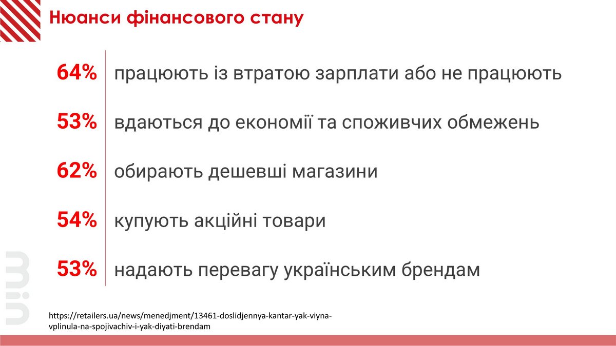 Согласно исследованию Kantar Ukraine, 64% украинцев работают за меньшие деньги или потеряли работу вообще и более половины потребителей настроены экономить при осуществлении закупок. В то же время, значительно вырос патриотизм и желание покупать украинское. Но, как показывают данные Gradus Research, главный критерий выбора магазина для совершения покупок – помогает ли бренд ВСУ. Это важно для 44% потребителей.