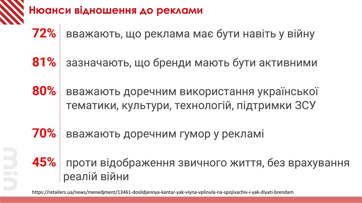 Поскольку люди ищут информацию, в том числе об акциях и скидках, им нужна реклама и именно поэтому 81% считают, что бренды должны быть активными и 72% – что нужна реклама во время войны.