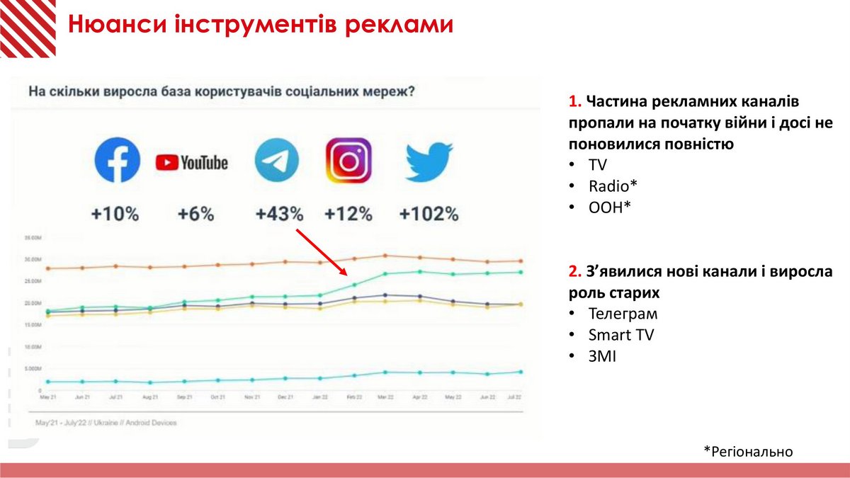 Еще один перспективный канал коммуникации с потребителем – Smart TV, которое перед войной только начало активно развиваться. Теперь Smart TV уверенно отбирает долю зрителей у традиционного телевидения, где реклама по разным причинам так и не возобновилась до довоенных показателей.