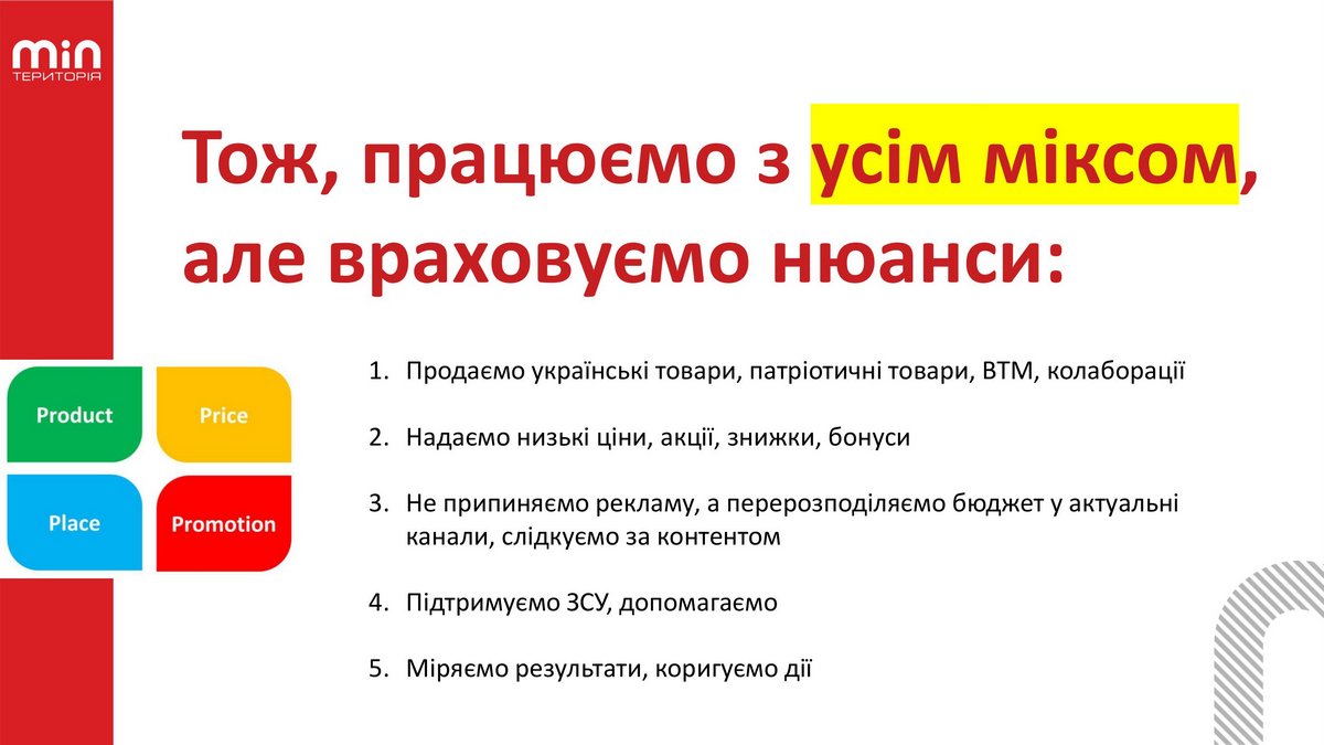 В ходе RAU workshop «Лидерство с помощью коммуникаций в военное время» директор по маркетингу сети Территория минимальных цен Наталья Хомик в своей презентации об актуальных инструментах маркетинга показала, как компания использует весь набор инструментов, постоянно адаптируя их применение под текущую ситуацию. RAU предлагает ознакомиться с основными тезисами этого доклада.