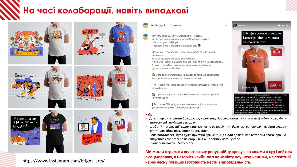 Если сначала сеть с успехом продавала патриотические товары исходя из предложения производителей, то впоследствии решили сделать собственные футболки с принтами. Но за день до начала продаж готовой партии выяснилось, что эти принты принадлежат bright arts Ярославы Яцубы – просто нанятый дизайнер взял их без разрешения иллюстратора из Днепра. Чтобы предотвратить репутационный скандал во времена, когда запрос на чесность в обществе очень высок, компания срочно связалась с автором и предложила варианты выхода из ситуации. В результате авторские права были куплены по $50 за принт, а вдобавок обе стороны на своих страницах в соцсетях рассказали об этой коллаборации. Так вместо хейта получили охват в 50 000 человек.