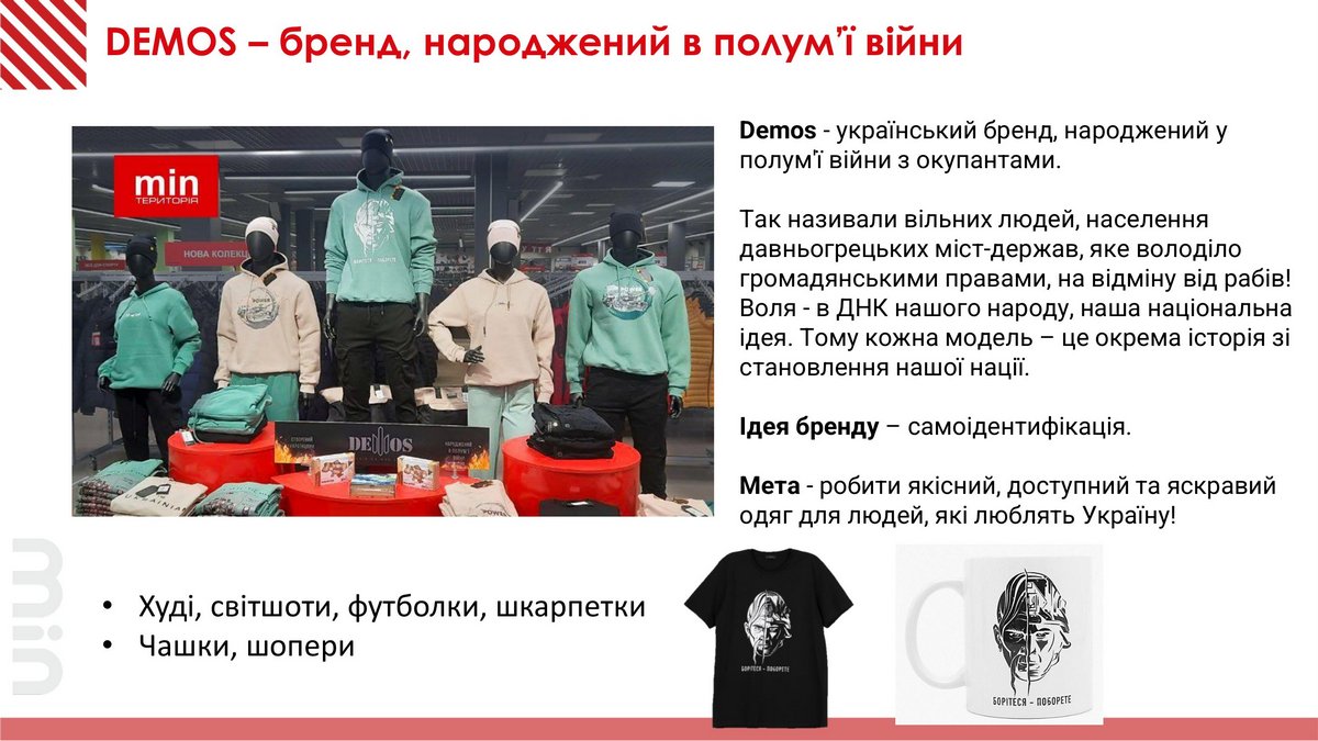 Эта история вдохновила на создание собственного бренда Demos (как идентификация свободных людей) под которым выпускались качественные и недорогие вещи для тех, кто любит Украину. Под этим брендом продаются худи, свитшоты, футболки, носки, чашки и сумки шоперы. Сейчас самое популярное изображение – с украинским козаком. Дополнительно при создании летней коллекции в коллаборации с Государственным торгово-экономическим университетом (ГТЭУ) был организован студенческий конкурс патриотических изображений для Demos. Созданные студентами рекламные агентства предложили 40 концепций (по 5-10 разработок в каждом). Товары с принтами-победителями хорошо продаются в магазинах.