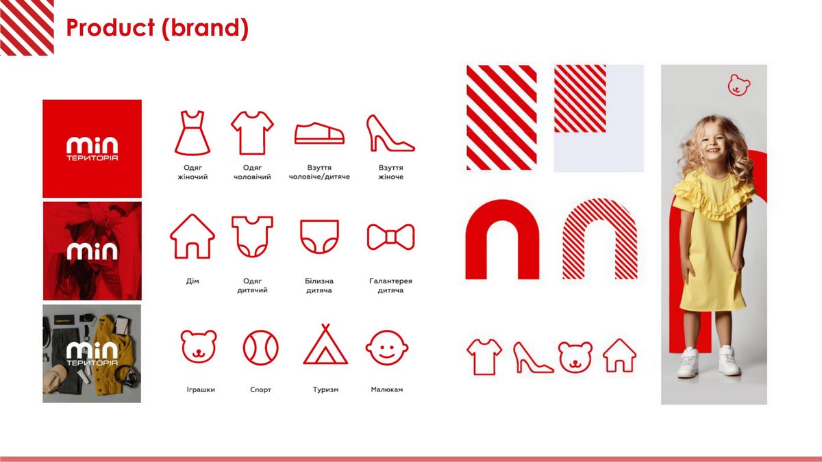 Главный клиент сети Территория минимальных цен – женщина, которая организовала всю семью в поход за покупками. Ее здесь называют менеджер семьи. Соответственно главная цель ритейлера – сделать так, чтобы именно этот клиент получил wow-эффект при посещении шоппинг центра, то есть превзойти его ожидания. Как показывают исследования, это вполне удается и узнаваемость бренда превышает в Киеве 90%. Теперь и логотип компании подчеркивает именно эту персону (буква I), вокруг которой собирается объединенная семья. В соответствующей стилистике оформлены и указатели товаров в торговом зале.