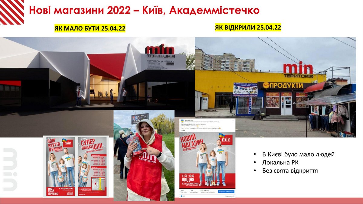 В ритейле торговое пространство – это часть продукта. В 2022 году это было менее важно. Важно было, чтобы магазины работали и продавали людям необходимые товары. Поэтому в Киеве открыли магазин не так, как планировалось: без торжеств, с локальной рекламной кампанией (с промоутером на улице и флаерами на кассе супермаhкета Novus) и небольшим количеством первых посетителей.