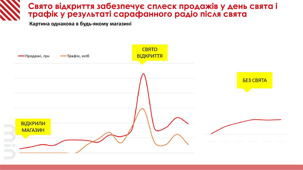 Кстати, это придает wow-эффект, когда в таком современном интерьере клиент видит цену в 99 грн. Соответственно открывали магазины во Львове со всеми возможными маркетинговыми активностями, включая участие диджеев и подарки покупателям. Особым успехом пользовалась лотерея и наложение аквагрима. Зачем нужно делать праздничное открытие – хорошо видно по графику ниже.