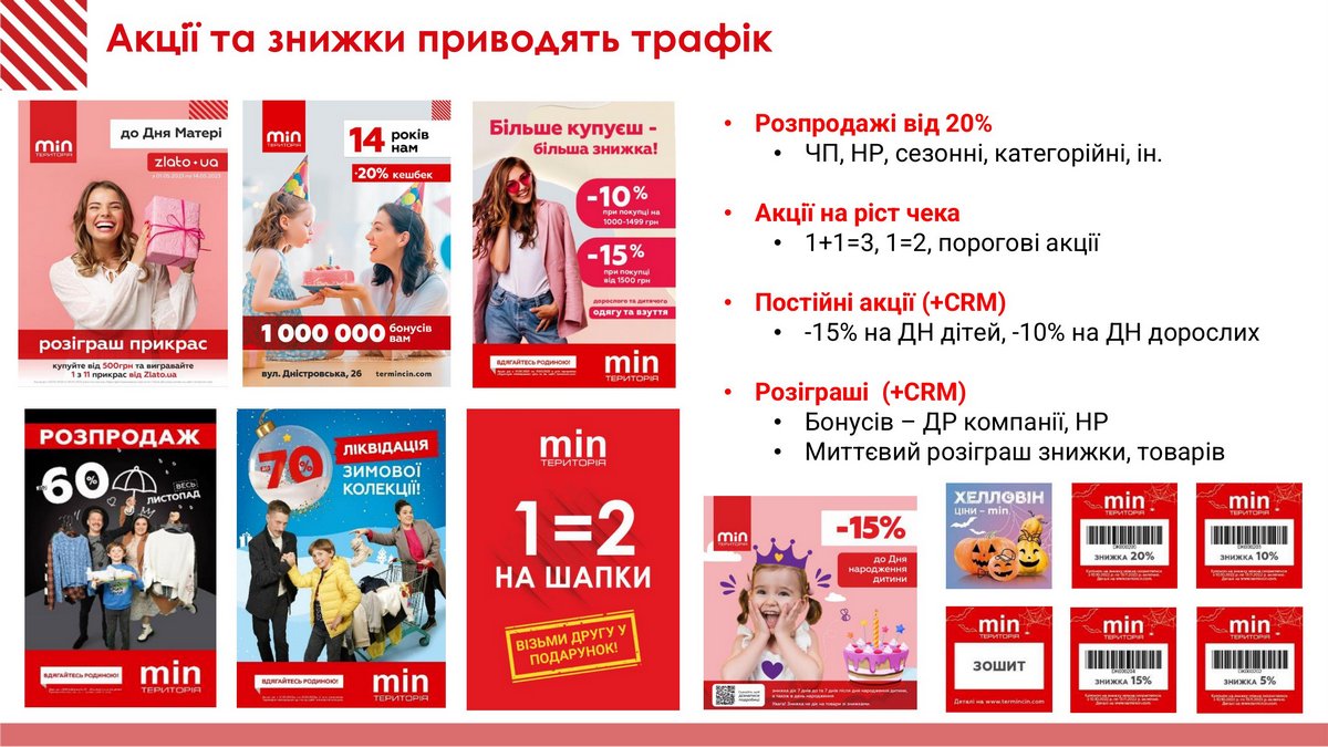 Территория минимальных цен представляет собой сеть крупных магазинов с широким ассортиментом товаров для всей семьи по выгодным ценам. Здесь есть все для жизни семьи: от одежды до игрушек, от велосипедов до декора и товаров для дома, а также товаров для домашних питомцев. В настоящее время она состоит из 17 шопинг-центров (12 магазинов в Киеве, по два во Львове и Ивано-Франковске и одного в Чернигове) и интернет-магазина termincin.com. Площадь каждого магазина составляет 2000–4000 кв. м. В общей сложности площадь всех магазинов равна 45 000 кв. м. Ежедневно сеть посещают около 20 000 клиентов и за полтора года войны компания накопила немалый опыт работы с покупателями в новых условиях.