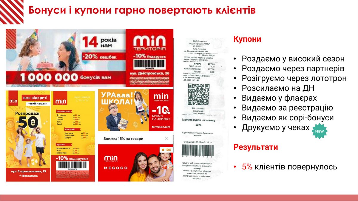 Точно так же бонусную программу не закрывали во время войны ни на один день, потому что это актуально, да еще и хорошо возвращает клиентов. Поэтому в 2023 году подняли бонус с 3% до 5%, а также прибавили категорийные бонусы по 20-30% когда это нужно. В то же время урезали возможность отоварить бонусы – теперь накопленными бонусами можно покрыть только 70% чека (акционными – 50%), а не 100%. Это позволило выровнять финансовую модель. Благодаря этому в разы выросла база рассылки по бонусным баллам (то есть, можно заработать больше по бонусной программе), а также в полтора раза поднялось количество возвратившихся клиентов. При этом расходы на бонусную программу остались на том же уровне.