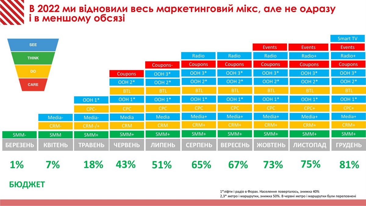 Если смотреть на воронку продаж, будет видно, что полностью маркетинговый микс восстановился только в декабре 2022 года, но по размеру бюджета был на уровне 81% от бюджета 2021-го. До полномасштабной войны было гораздо больше фана (крылья у манекенов, фотозона, розыгрыши и т.п.)