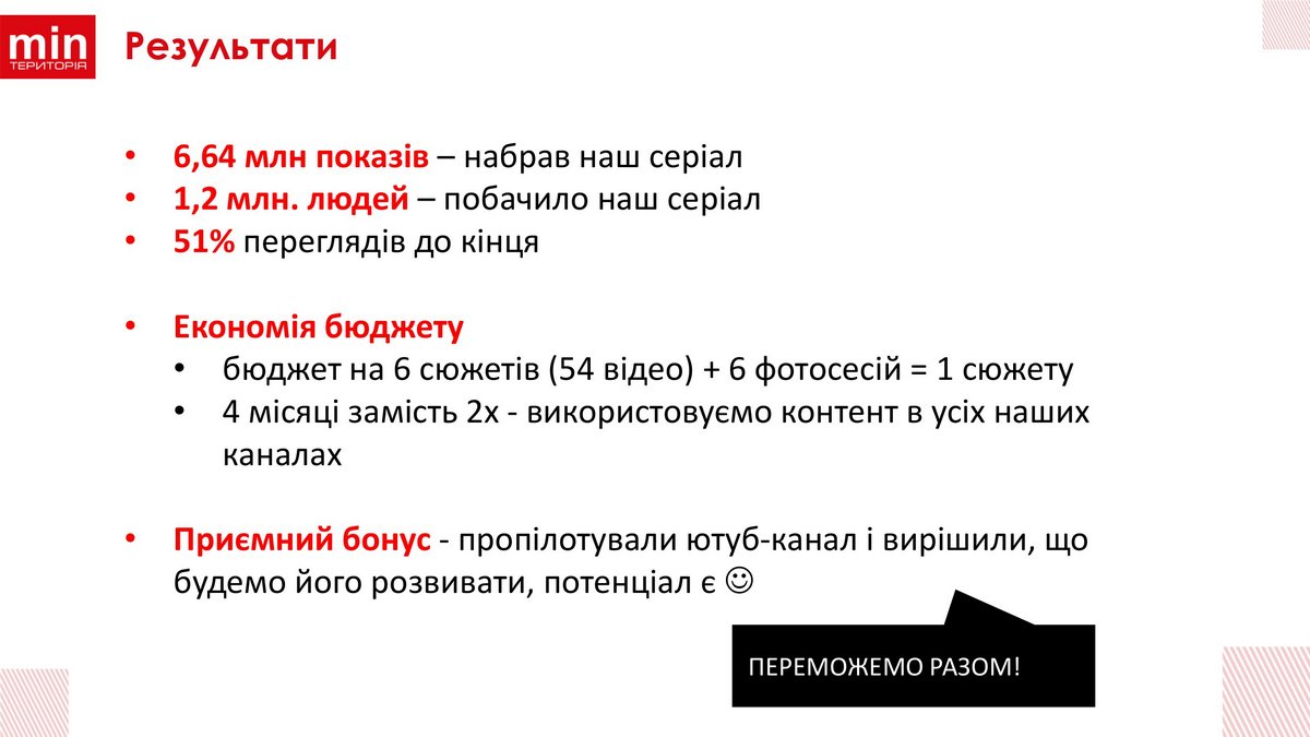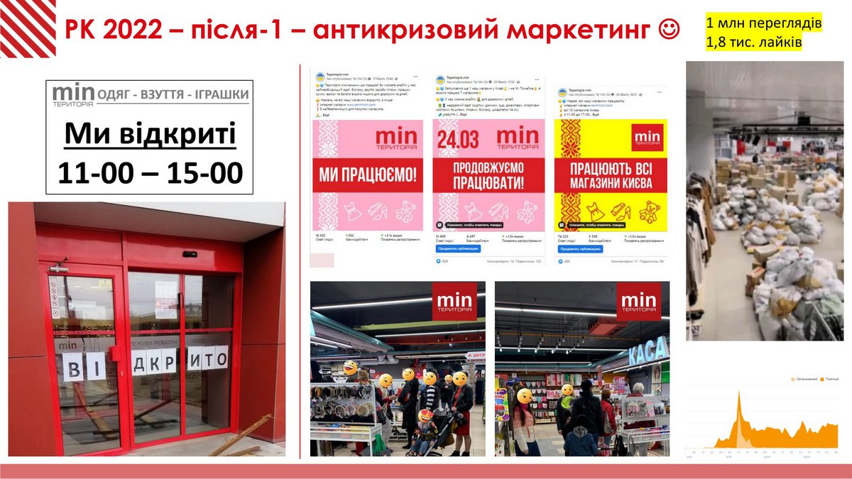 В общем-то маркетинг Территория минимальных цен во время войны можно разделить на три этапа. Первый – когда достаточно было сообщить через соцсети, что магазины работают. Также 1 млн просмотров набрал ролик о том, как доставляют товар в магазин возле метро Почайна со склада в Чернигове. И здесь тоже удалось превратить негатив в позитив, потому что началась волна хейта по поводу перепродажи гуманитарки. Компания честно написала, как пытается доставлять товар со складов в зоне боевых действий и перестала оправдываться и что-либо объяснять. В результате получили около 2000 лайков.