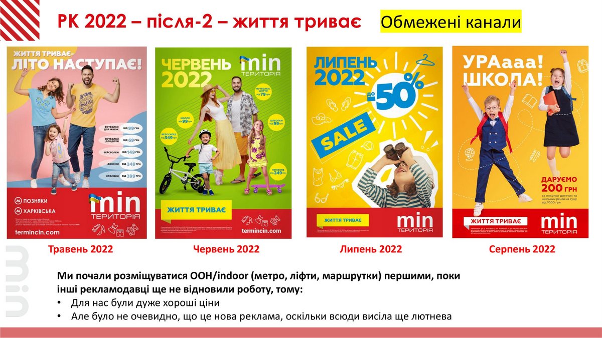 На втором этапе нужно было донести людям, что жизнь продолжается, война может быть долгой и нужно жить сейчас, покупая необходимые вещи. Но первое сообщение в мае просто потерялось среди старой «февральской» рекламы, продолжавшей висеть в транспорте. Сработало сообщение в лоб – большими цифрами и буквами о новом рекламном периоде.