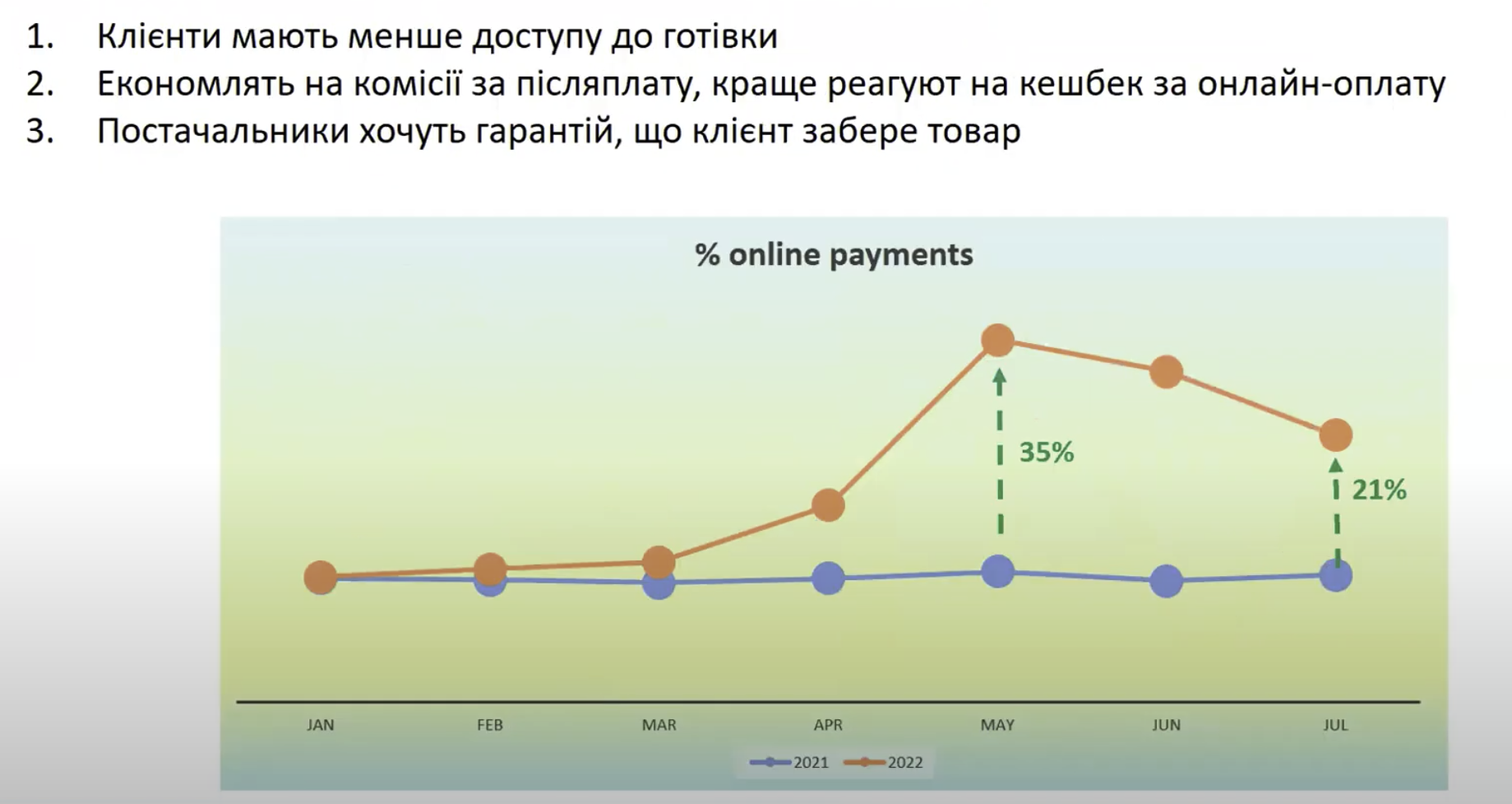Интересно, что значительно возросло количество онлайн-платежей, поскольку клиенты имели меньший доступ к наличке (особенно в первые месяцы). А сейчас они экономят на комиссии по оплате во время доставки и лучше реагируют на кэшбек при оплате картой. То есть, значительная часть наших клиентов сейчас очень хорошо реагирует на косвенные источники экономии. А поставщики сейчас хотят иметь гарантии, что клиент заберет товар, поскольку люди постоянно перемещаются, поэтому активнее предлагают вариант с предоплатой.