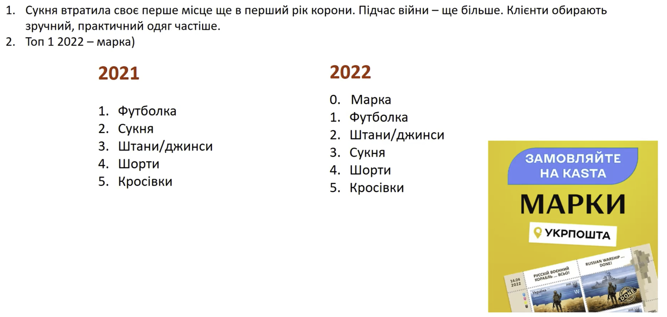 Главные товара продажи по сравнению с прошлым годом не изменились – это кроссовки и футболки. А нулевой рейтинг занимает марка Укрпочты, которая сейчас находится в топ-продажах.