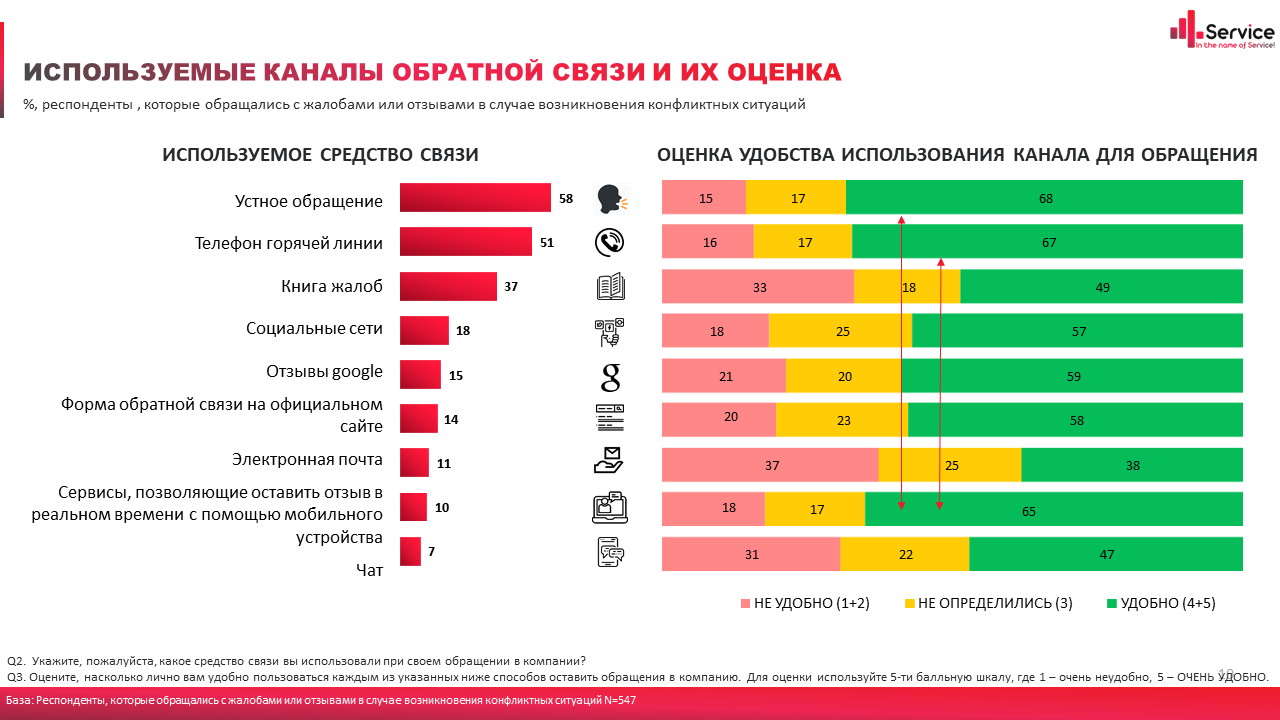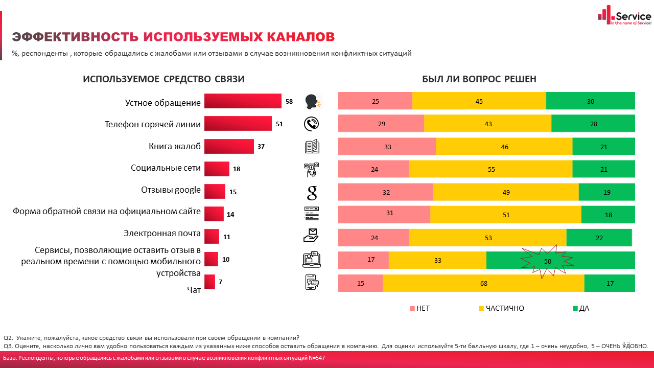 Исследователи уделили особое внимание изучению не только предпочтений и удобства использования разных каналов обратной связи, но и их эффективности. Респонденты отвечали, насколько быстро удалось связаться с ответственным лицом, был ли вопрос решен и удовлетворен ли в итоге сам потребитель решением вопроса.