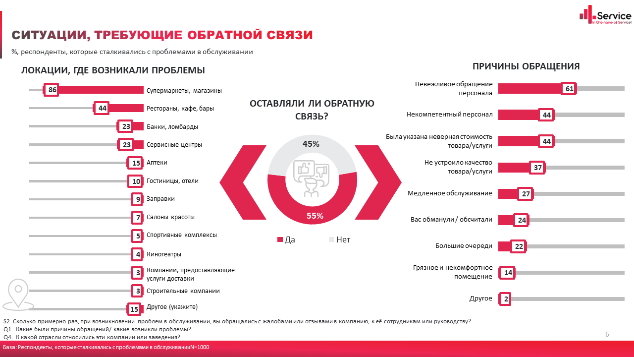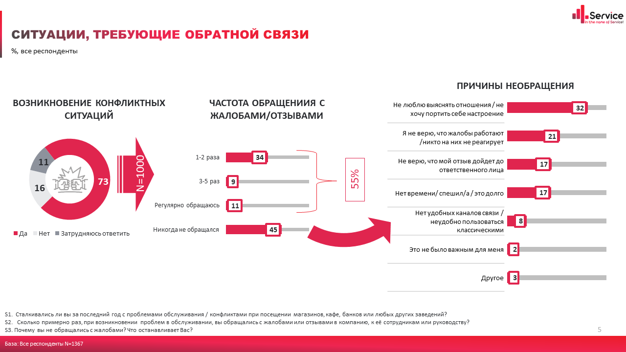 Почти половина (45%) опрошенных людей заявила, что никогда не обращались с жалобами, так как не верят в их эффективность. Из них 21% опрошенных основной причиной назвали низкую вероятность того, что кто-либо отреагирует на их отзывы.