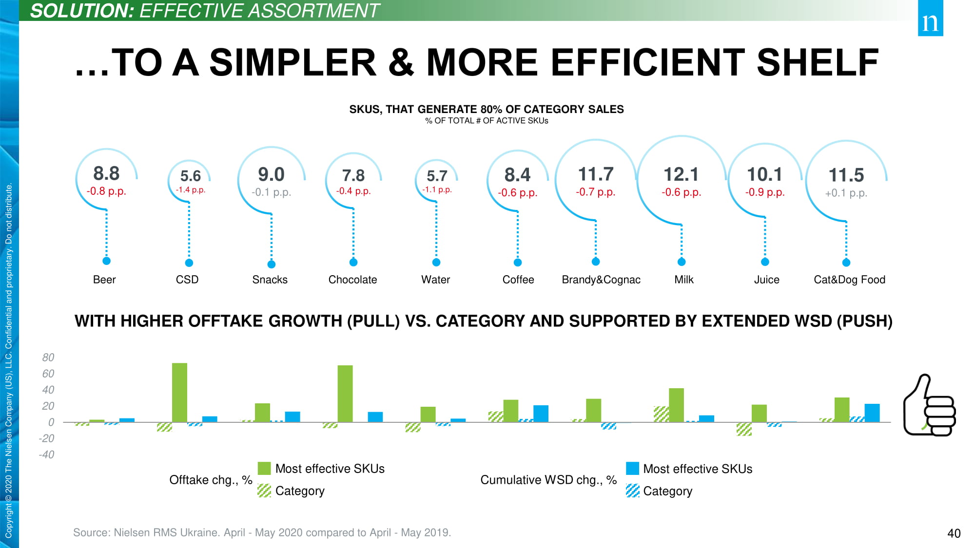 Применяя принцип Парето к ритейлу, в среднем 20% SKU делает 80% продаж. Остальной ассортимент свой небольшой выхлоп дает, но его не так просто поддерживать. Nielsen разложили ключевые категории, представленные в апреле – мае 2020 года на товарной полке по сравнению с тем же периодом прошлого года. Оказывается, что в категории «вода» только около 6% SKU делает 80% продаж в своем сегменте, в категории «шоколад», к примеру, – около 8%.