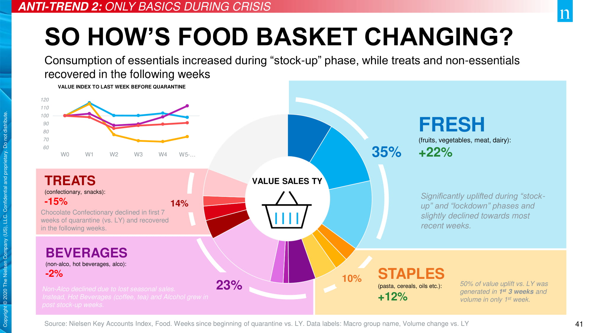 Существует стереотип, что во время кризиса потребитель отказываются от всего, кроме базовых продуктов. Они действительно в корзине занимают большую долю – категория «Fresh» (фрукты, овощи, мясо, молочные продукты) около 35% и их доля во время фазы «запаса» весной возросла на 22%. Но уже спустя семь недель после начала карантина потребление лакомств и необязательных покупок восстановились. Такая же история и с безалкогольными напитками.