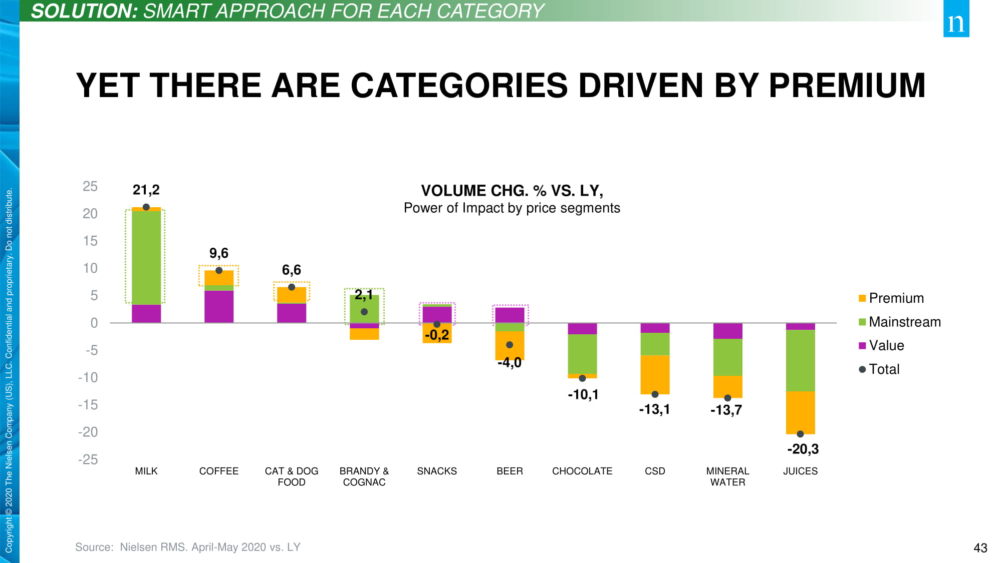 Позиция, что в кризис популярны только базовые продукты – ошибочен. Тотальная экономия на всем в условиях кризиса присутствует, но нельзя этот тренд применять ко всем категориям. Продукты в более низкой ценовой категории показывают либо меньшее падение, либо рост, но есть и исключения. Каждая категория ведет себя по-разному. Например, в категориях «кофе» и «кормов для животных» одним из ключевых драйверов роста является как раз премиальный ценовой сегмент. В «кофе» – это 9,6% прироста, часть из которого сделал как раз таки премиум. Сыграла специфика категории, где потребление напитка для энергии и удовольствия вне дома частично перешло в уютный быт без тотальной экономии на привычной уже рутине. Такие примеры наблюдаются во многих категориях товаров, где премиум покупался и продолжит покупаться.