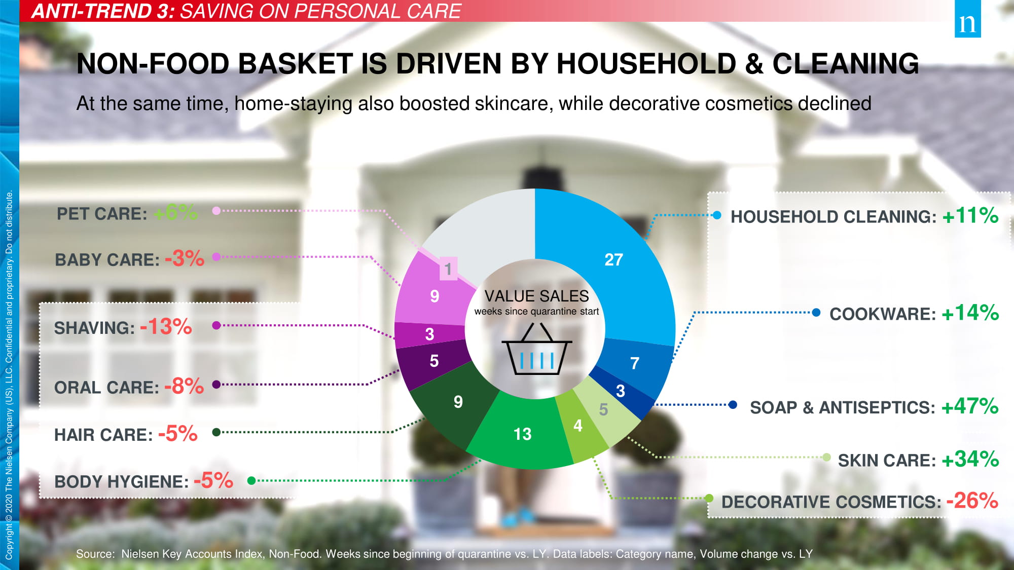 Еще один стереотип, что когда люди уходят на дистанционную работу, то продукты по уходу за собой меньше пользуются спросом и в продажа падают. В коронакризис Nielsen наблюдает интересный тренд: рост продаж товаров для домашней уборки, а также продуктов по уходу за кожей. Таким образом сегодня непродовольственная корзина управляется домашним хозяйством и декоративной косметикой.