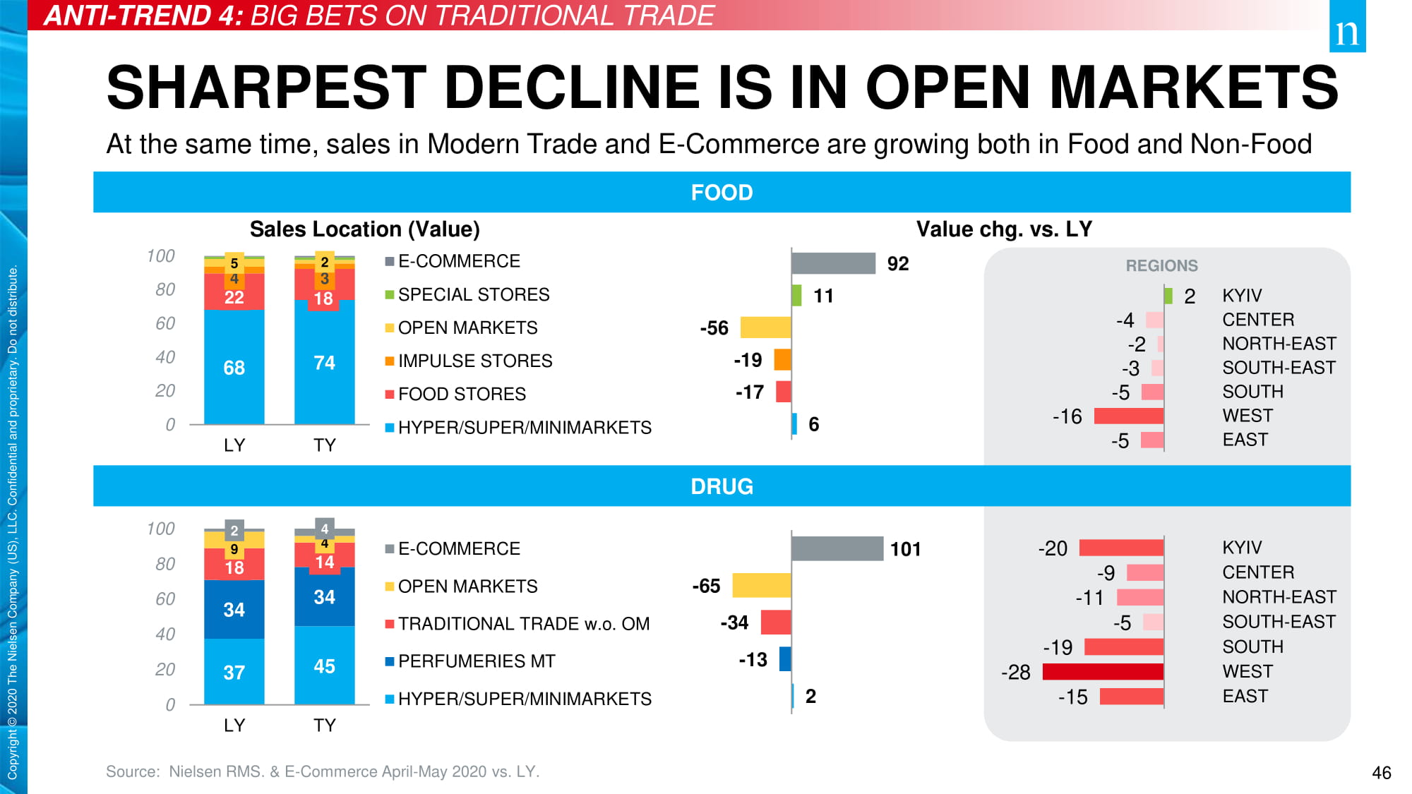 Самый резкий спад продаж наблюдается на открытых рынках. Все этого говорит о том, что нет смысла ритейлу вести себя так же, как прежде. Наблюдение показало, что продажи в наиболее современной рознице и, особенно, электронной коммерции растут как в пищевой, так и в непродовольственной сфере. Традиционная FMCG-розница становится все более диджитализированной и это привлекает покупателя.