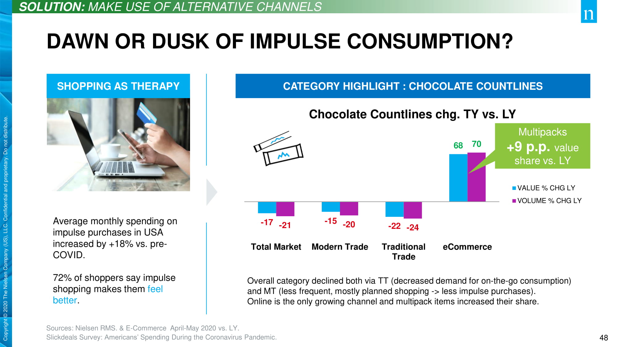 В Украине мы тоже наблюдаем этот тренд – украинцы покупают часть продуктов не столько из нужды, сколько, чтобы получить удовольствие. То есть онлайн – это уже не вынужденный переход в новый канал, но также предмет и повод себя как-то побаловать и развлечь. Доля одних только шоколадных батончиков во время жесткого карантина в e-commerce выросла на 70%. Та же история с продажами кофе, который в традиционной торговле, по сравнению с прошлым годом, наоборот, как категории упал. Зато прибавил в e-commerce.