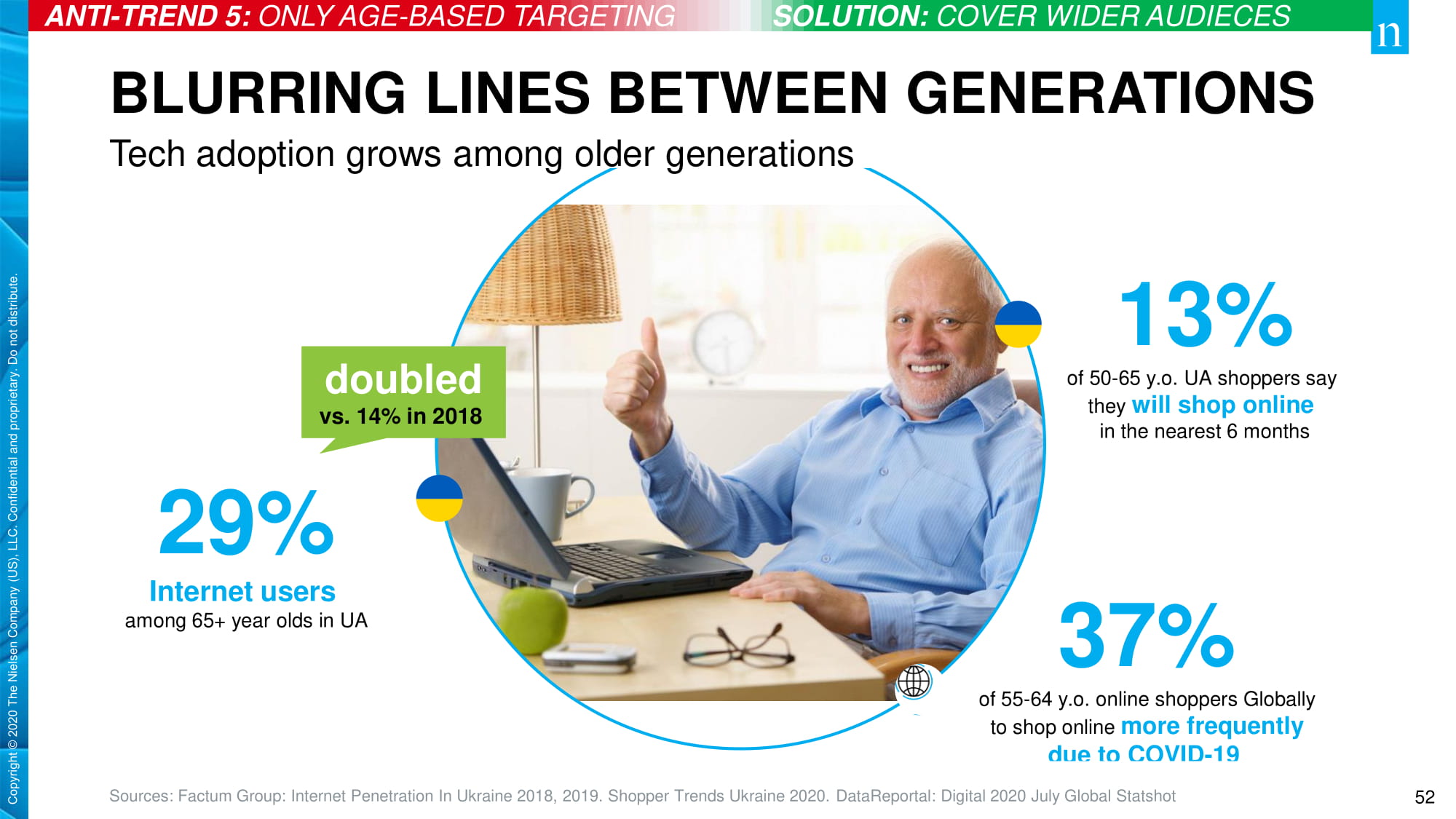 Разницы между поколения размывается. Теория поколений, согласно которой Z более диджитализированные, частично становится анти-трендом. Старшие поколения быстрыми темпами осваивают онлайн-пространство с его преимуществами и технологиями, и уже быстро в нем ориентируются. Они уже могут сами что угодно скачать, купить, написать отзыв и т.д. Потому свое диджитал-пространство правильнее всего будет организовывать таким образом, чтобы оно было понятно любой возрастной группе.