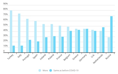 Согласно результатам исследования, нормы социальной дистанции заставили потребителей пересмотреть частоту ежедневных покупок в офлайн-магазинах, включая размеры и наполнение продуктовых корзин. Существенное сокращение количества потребителей, которые совершают покупки в супермаркетах, наблюдается в таких странах, как Польша, Италия и Франция, где подавляющее большинство потребителей (80%, 78% и 71% соответственно) заявили, что они меньше покупают в супермаркетах во время пандемии . Исключение составляют российские потребители, 62% которых заявили, что они совершают такие же покупки в физических магазинах, как и до вспышки болезни.