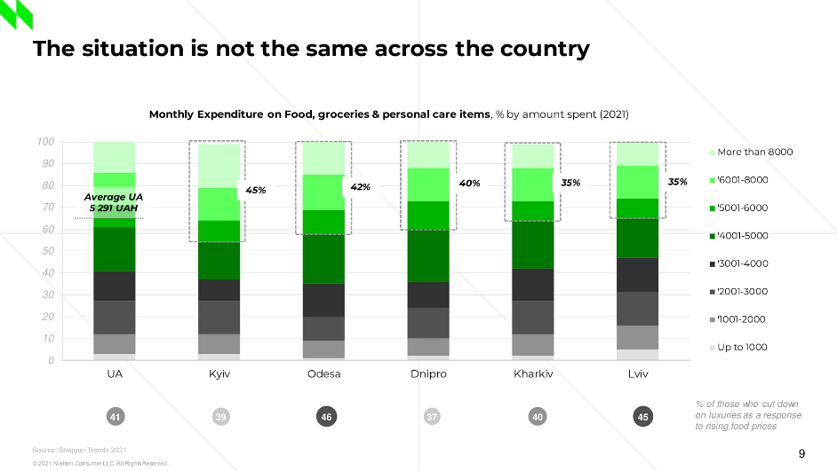 Но в разных городах Украины ситуация отличается, ведь практически половина киевлян тратят на FMCG-корзину более 5000 гривень, а, например, в Харькове и во Львове только около трети потребителей могут себе позволить такие расходы.