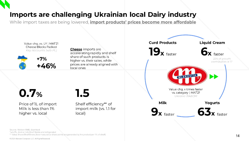 Импорт начал активно проникать в продуктовые категории, так например, в сегменте сыра он растет на 40% быстрее, чем отечественные производители. Цены также между отечественными и иностранными производителями сравнялись.