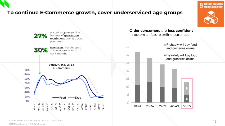 Онлайн-канал стал героем роста в 2020 году, как благодаря увеличению трат уже существующих покупателей, так и приходу новых, которые стремились социально дистанцироваться. Но в 2021 году этот канал продаж замедлил свой рост. Поэтому ритейлерам нужно искать способы активно привлекать новых потребителей разных возрастных групп, рассказывая о преимуществах онлайн-покупок.