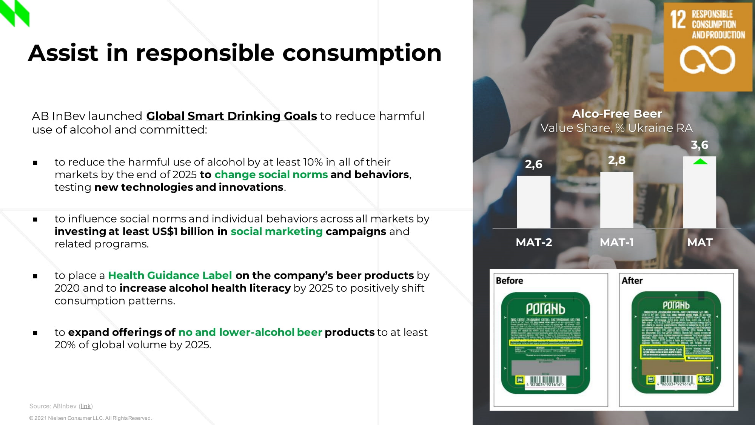 В дополнение к заботе об окружающей среде важно заботиться и об ответственном потреблении. На алкогольном рынке этот тренд проявляется ростом сегмента безалкогольного пива и напитков с уменьшенным содержанием алкоголя, что соответствует глобальным целям лидеров рынка.