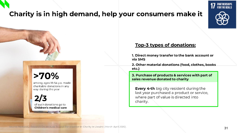 70% украинских потребителей утверждают, что занимались благотворительностью за последний год и две трети пожертвований были направлены на медицинскую помощь. Пожертвования осуществлялись через непосредственный перевод средств на банковский счет, материальные взносы (продукты, одежду или книги) и приобретение тех товаров, деньги от продажи которых будут направлены на благотворительность. Каждый четвертый житель больших городов Украины принимал участие в такой акции и покупал подобные товары в течение прошлого года.