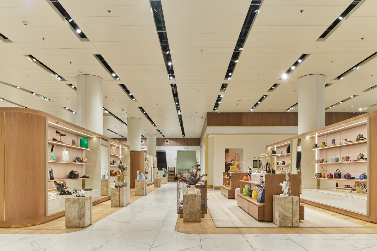 Мультибрендовое пространство занимает более 200 кв. м. В интерьере преобладают природные цвета, минималистичные формы и премиальные фактуры. Атмосферу комфортного шопинга подчеркивают элементы дизайнерского декора Anissa Kermiche, статуэтки Leblon Delienne и флористические композиции.