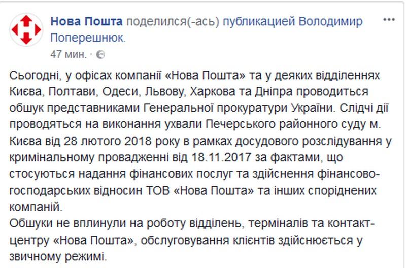 Как сообщает официальная страница компании в Facebook, “Следственные действия проводятся во исполнение постановления Печерского районного суда г. Киева от 28 февраля 2018 года в рамках досудебного расследования в уголовном производстве от 18.11.2017 по фактам, касающихся предоставления финансовых услуг и осуществления финансово-хозяйственных отношений ООО «Нова пошта» и других родственных компаний.
