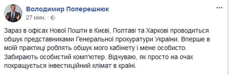 В пятницу, 16 марта, представители Генеральной прокуратуры Украины пришли с обысками в офисы крупнейшего частного почтового оператора страны Нова пошта. На своей странице в социальной сети Facebook соучредитель компании Владимир Поперешнюк пишет: “Сейчас в офисах Нова пошта в Киеве, Полтаве и Харькове проводится обыск представителями Генеральной прокуратуры Украины. Впервые в моей практике делают обыск моего кабинета и меня лично. Забирают личный компьютер. Чувствую, как прямо на глазах улучшается инвестиционный климат в стране”.