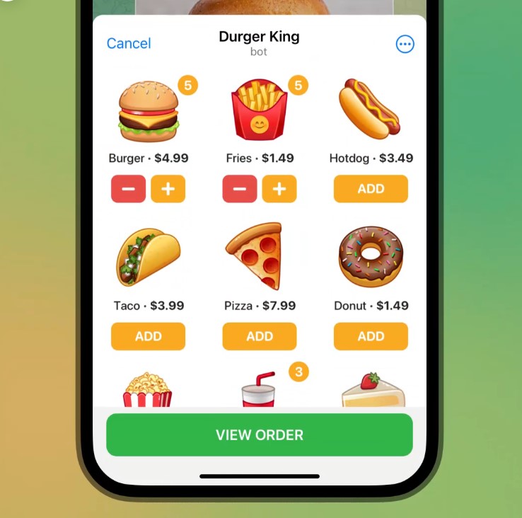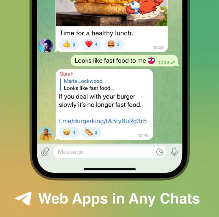 Telegram позволил с помощью ботов запускать веб-приложения прямо в мессенджере. Если бот поддерживает эту функцию, веб-приложение будет доступно по прямой ссылке или названию бота в любом чате в Telegram. К примеру, можно набрать в поле ввода @durgerkingbot (с пробелом после названия) или отправить в группу ссылку: https://t.me/DurgerKingBot/menu и предложить ее участникам режим совместной работы или игры. В настоящее время боты Telegram имеют интегрированные платежи через 20 платежных поставщиков (в том числе Google Pay и Apple Pay), доставку индивидуальных push-сообщений пользователям и многое другое.
