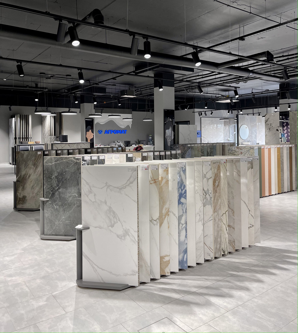 Агромат в Днепре – это 1100 кв. м территории подлинного дизайна. Минималистичная концепция магазина выполнена с вкраплением лофтовых элементов и яркими динамическими паттернами на стенах в стиле поп-арт. Ассортимент идеально подобран по последним интерьерным трендам и представлен в виде эстетических стендов. Особенно впечатляют экспозиции с плиткой XL форматов в полный рост. Это популярные сегодня реалистичные имитации ониксов и мраморов и супермодные цветные камни.